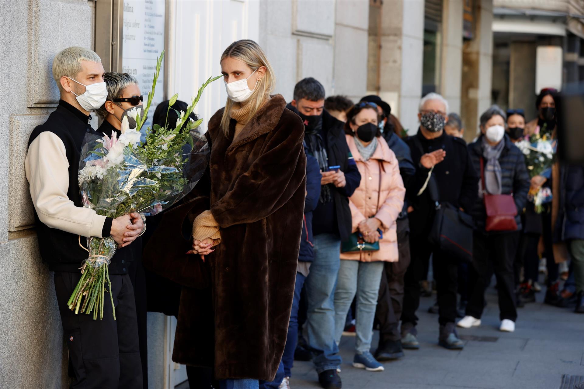 Ciudadanos esperan su turno a las puertas del Teatro Español donde ha llegado estes miércoles el féretro de la actriz Verónica Forqué y se ha instalado la capilla ardiente, ente aplausos de periodistas, cámaras de televisión y curiosos que se han congregado para dar el último adiós a la actriz.