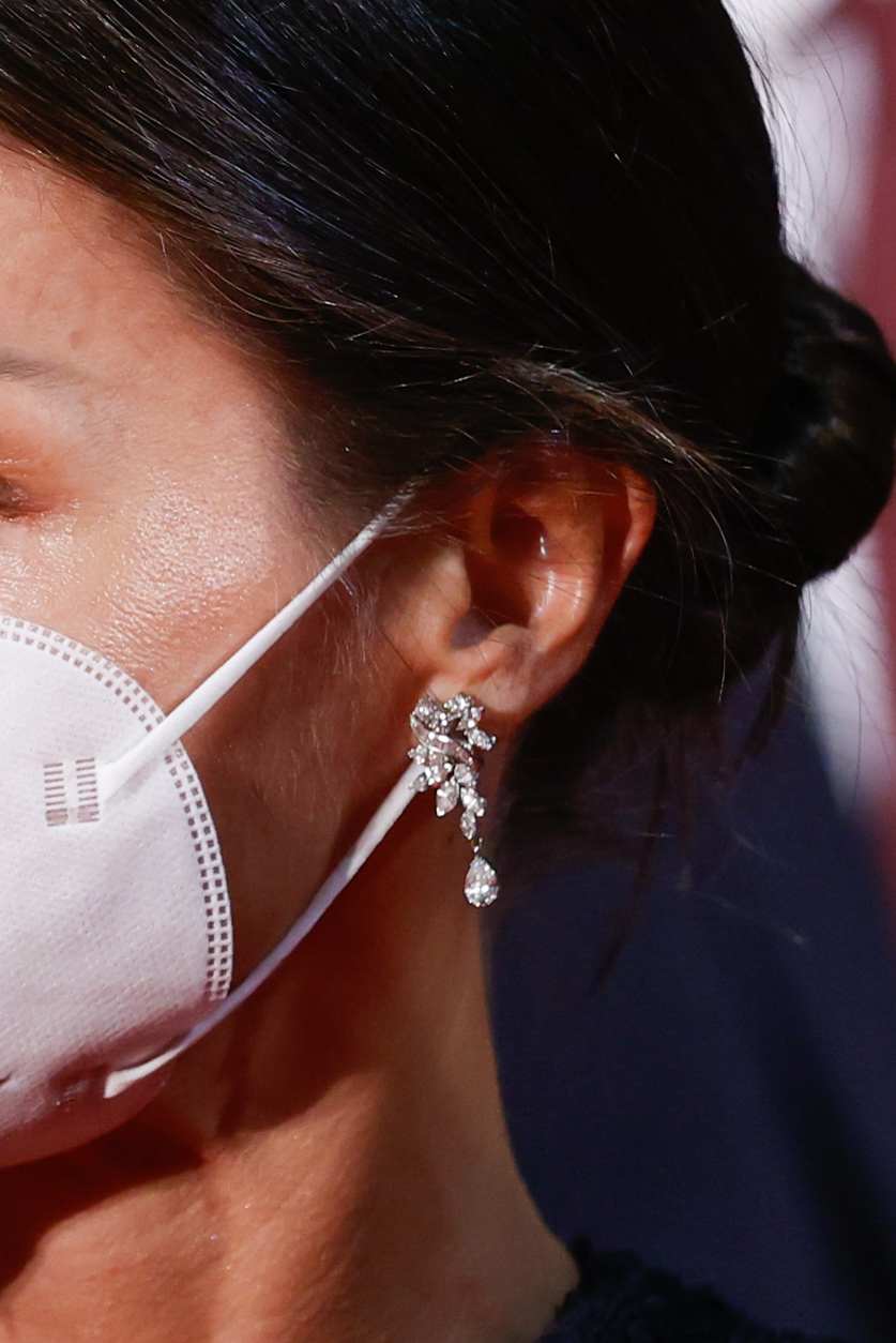 Letizia se ha decantado por los pendientes de diamantes con forma de flor y una pulsera que combina diamantes y zafiros que ya le hemos visto anteriormente y que combinaba estupendamente con la ropa.