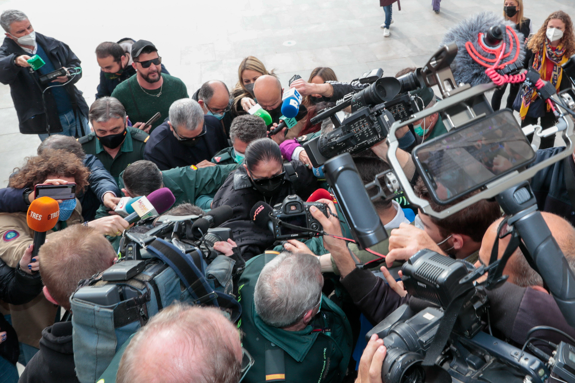 Rodeada por media docena de guardias civiles, la artista ha avanzado a paso lento hasta la sede judicial. Dentro, Pantoja no pudo evitar derrumbarse nada más comenzar el juicio, y el juez tuvo que emplear cinco minutos en tranquilizarla tras echarse a llorar.