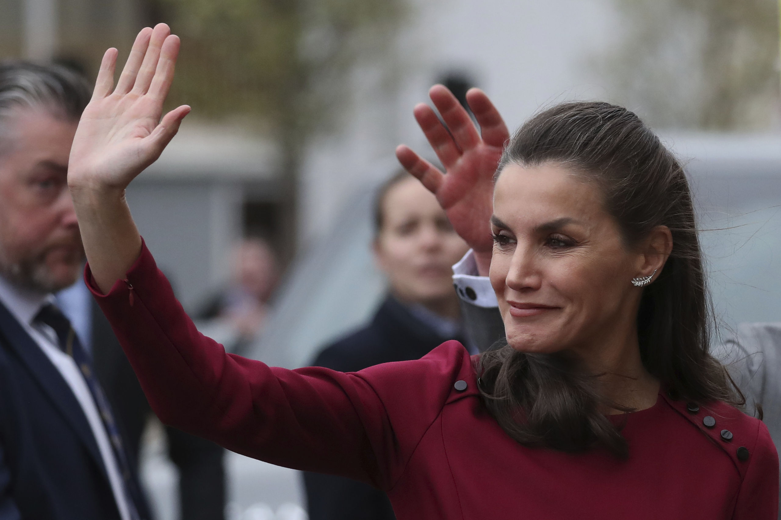 La reina Letizia se protegió del frío con un abrigo negro de Carolina Herrera de estilo oversize. Debajo, lució un vestido de la misma firma en color burdeos, de manga larga, cuello redondo, y botonadura negra en uno de los hombros.