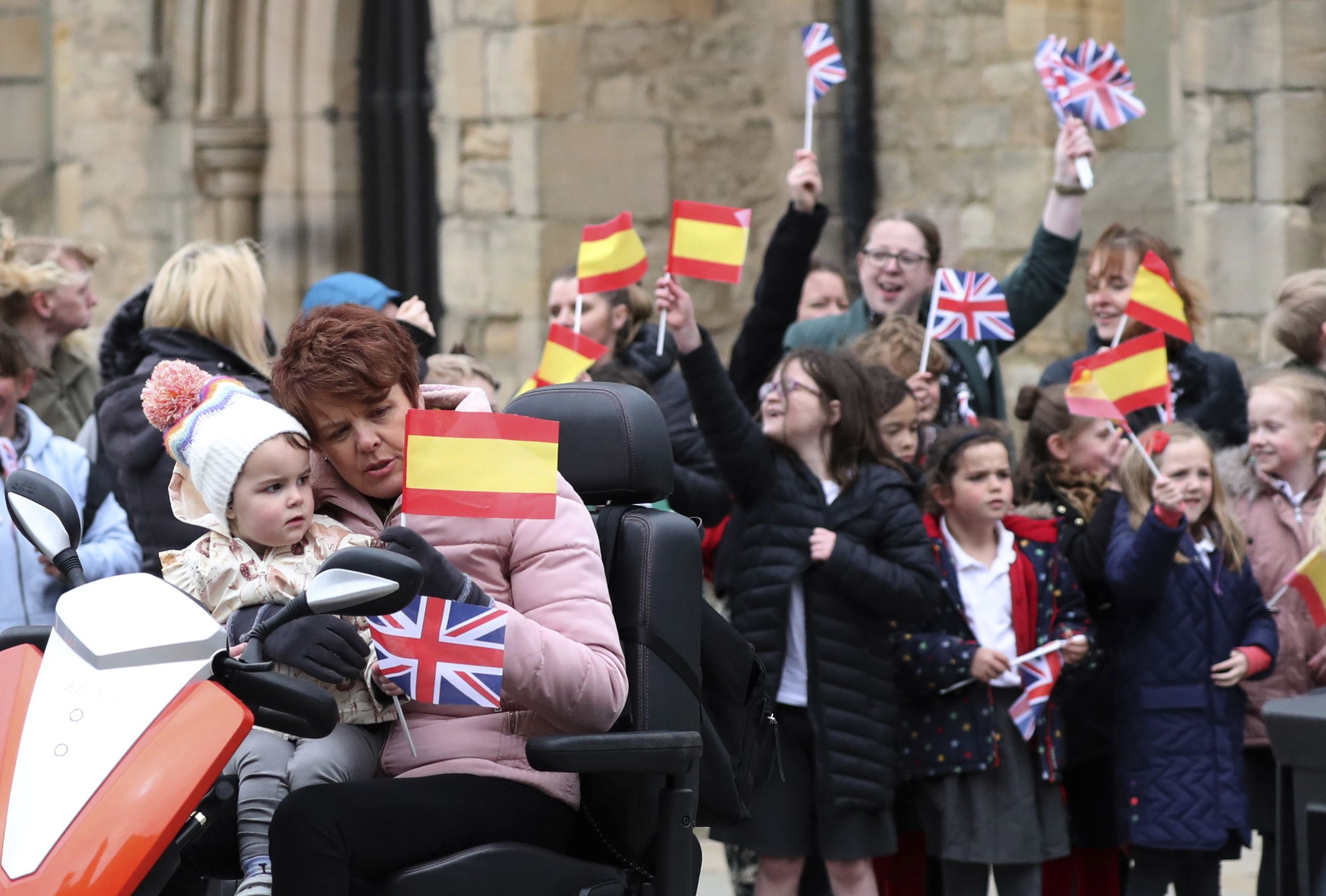 Recibimiento de vecinos y curiosos con banderas de España y Reino Unido.