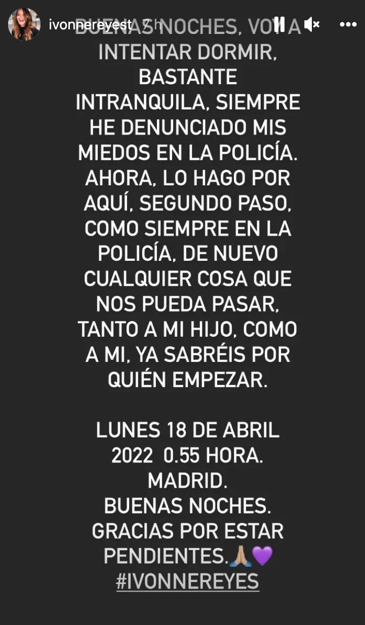 "Buenas noches. Voy a intentar dormir. Bastante intranquila. Siempre he denunciado mis miedos en la Policía, ahora lo hago por aquí, segundo paso. Como siempre en la Policía, cualquier cosa que nos pueda pasar, tanto a mi hijo como a mí. Ya sabréis por quien empezar", ha escrito Ivonne en su Instagram, dejando entrever que habría sufrido amenazas del comunicador tras sus últimas declaraciones.