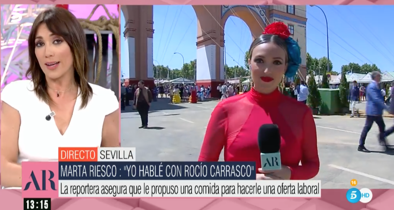 Caos total a raíz de la llamada del director de Lecturas, Luis Pliego, a Marta Riesco para ofrecerle una supuesta oferta musical de Rocío Carrasco. La reportera entró desde la Feria de Sevilla en El Programa de AR para reiterar de nuevo su versión: que solo después de la conversación con el periodista y la hija de Rocío Jurado se le dijo que era una oferta artística.