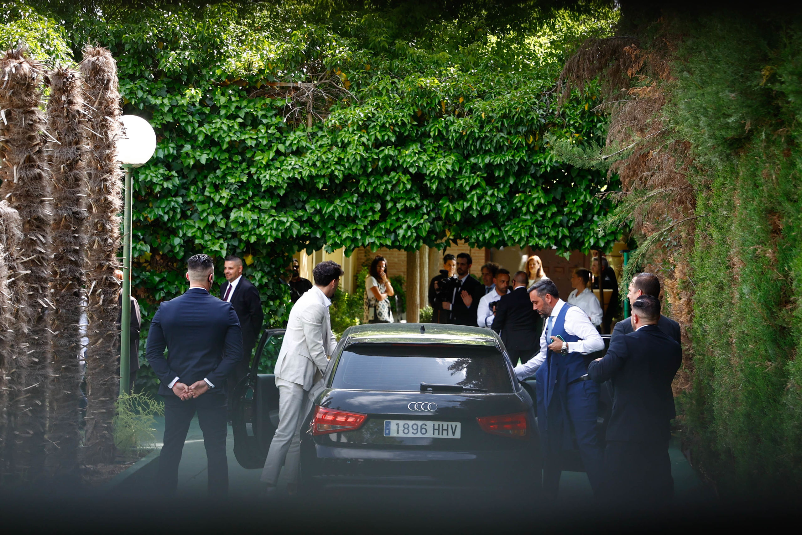 El hijo de Carmen Borrego llegó a la finca pasadas las 17:30 horas y con un traje oscuro firmado por el diseñador Félix Ramiro que ha combinado con camisa blanca.