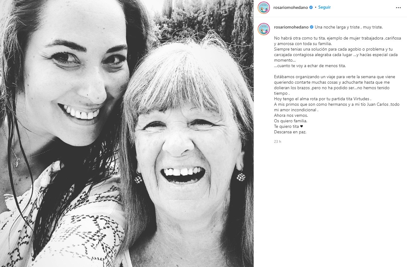 Rosario Mohedano ha sido la encargada de dar la triste noticia: este miércoles ha muerto su tía Virtudes tras una larga enfermedad. "Una noche larga y triste, muy triste, empezaba la emotiva carta que la cantante ha hecho pública a través de su perfil de Instagram. "No habrá otra como tú tita, ejemplo de mujer trabajadora, cariñosa y amorosa con toda su familia", escribía la cantante junto a una fotografía de ambas en blanco y negro.