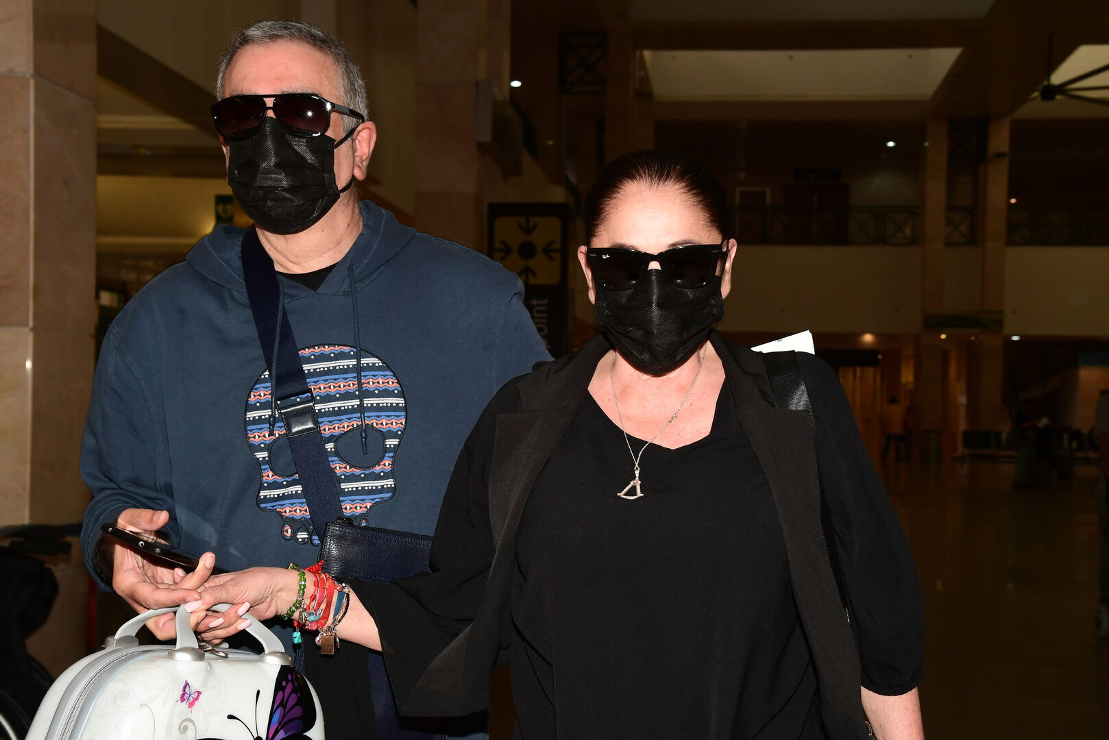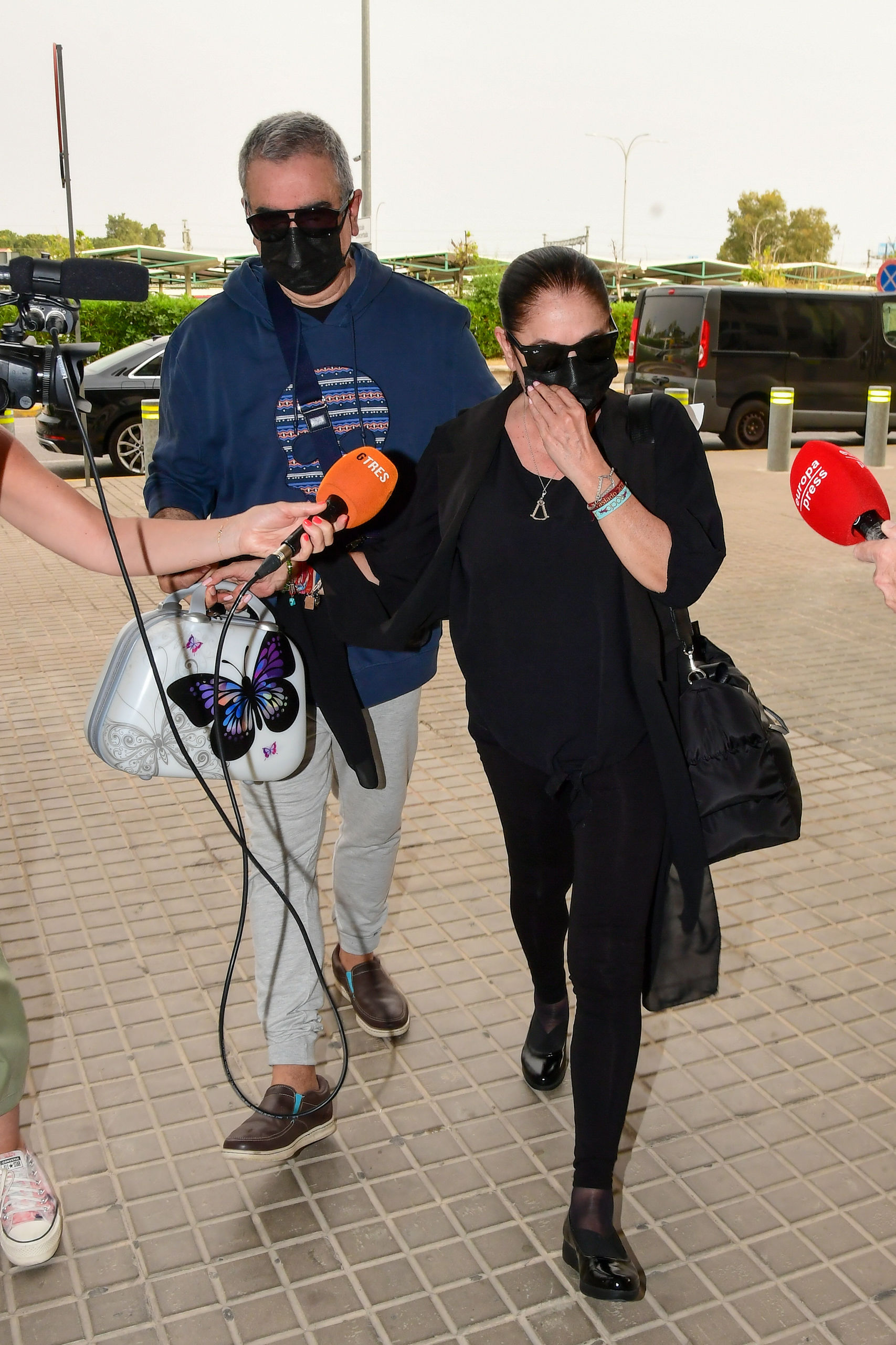 De luto, con ganas de sol y mascarilla negra que apenas dejaba ver su rostro, así ha reaparecido este sábado Isabel Pantoja en el aeropuerto de Sevilla antes de poner tumbo a Buenos Aires, Argentina, para dar comienzo a su gira latinoamericana. Acompañada de su inseparable hermano, la tonadillera ha esperado en el coche hasta que Agustín ha solucionado en papeleo en el aeropuerto, cuando ha terminado ambos han entrado en el mismo mostrándose amables con la prensa: "Buenos días", ha dicho la artista a los medios allí presentes.