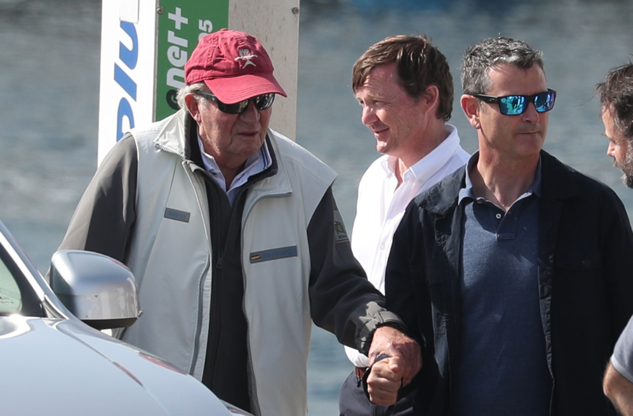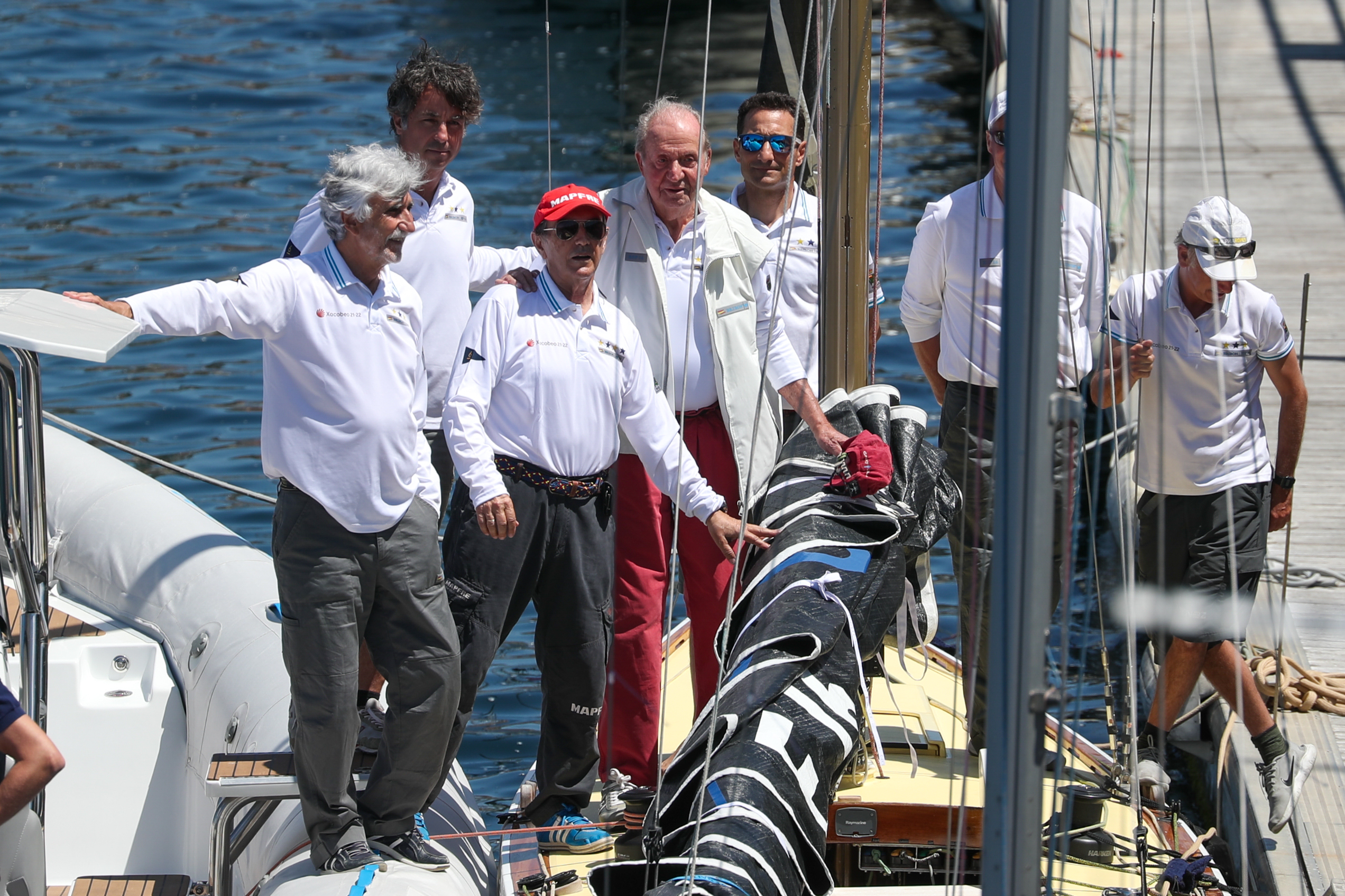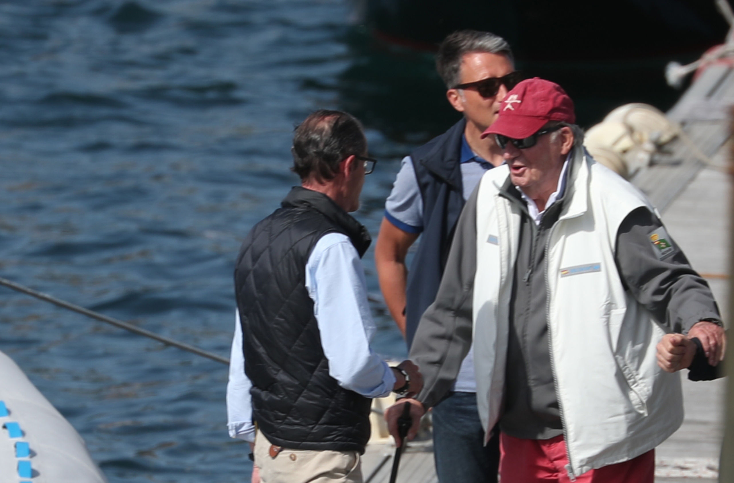 Antes de viajar de copiloto en el vehículo particular del regatista Pedro Campos, su amigo y anfitrión durante su estancia en Sanxenxo, pues se aloja en su chalet, el padre de Felipe VI, después de atracar en el pantalán, se ha parado con unas personas a hablar de manera breve.