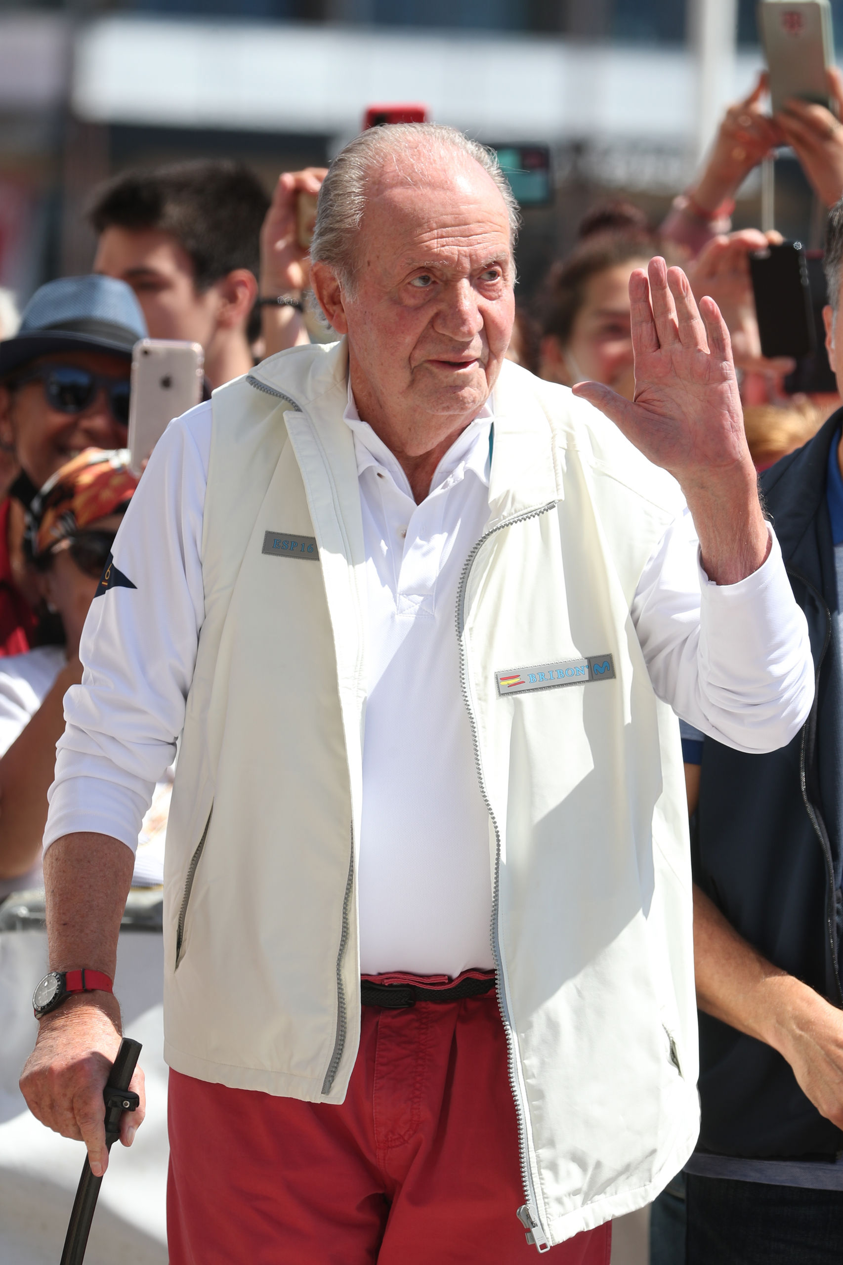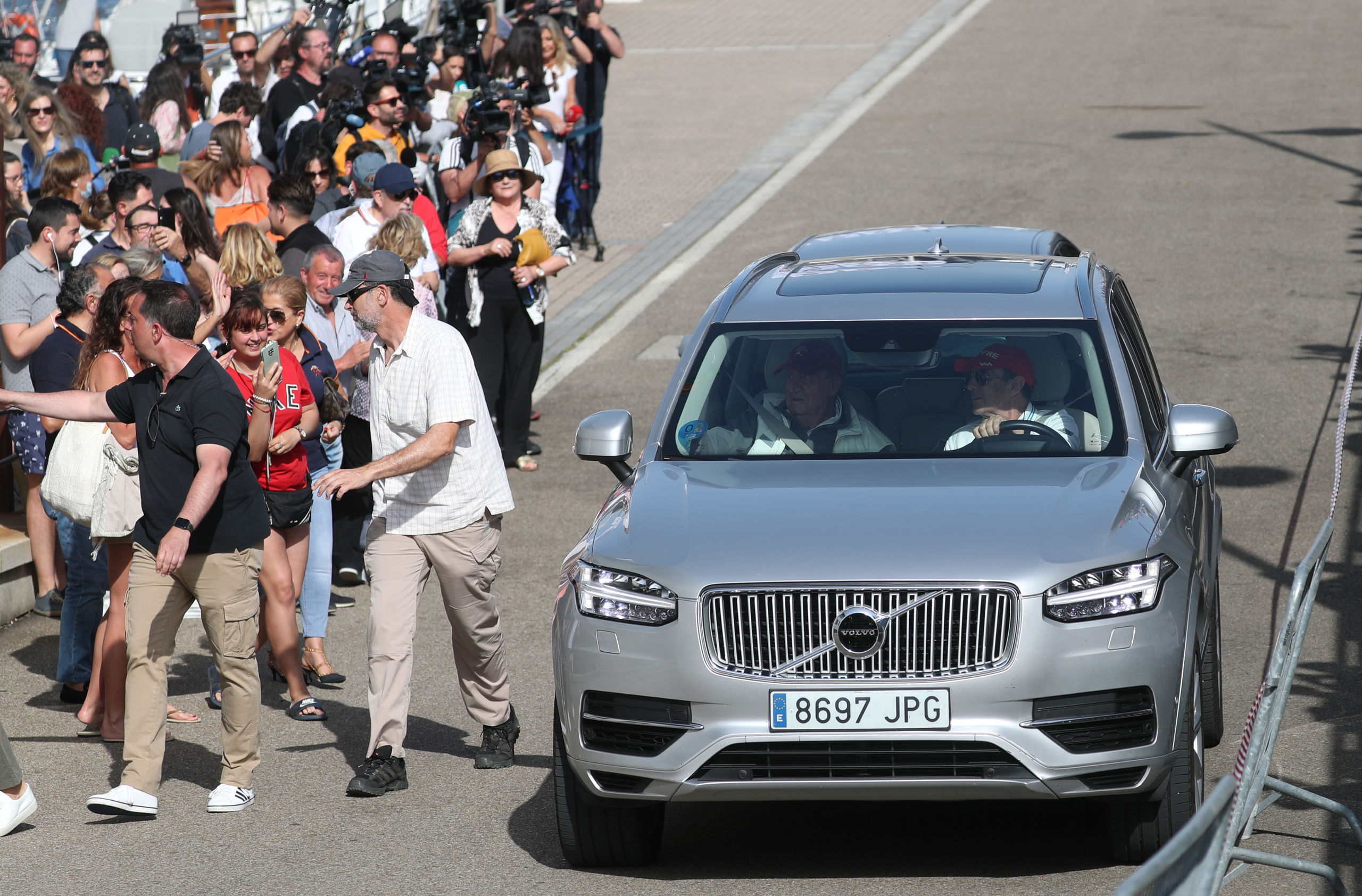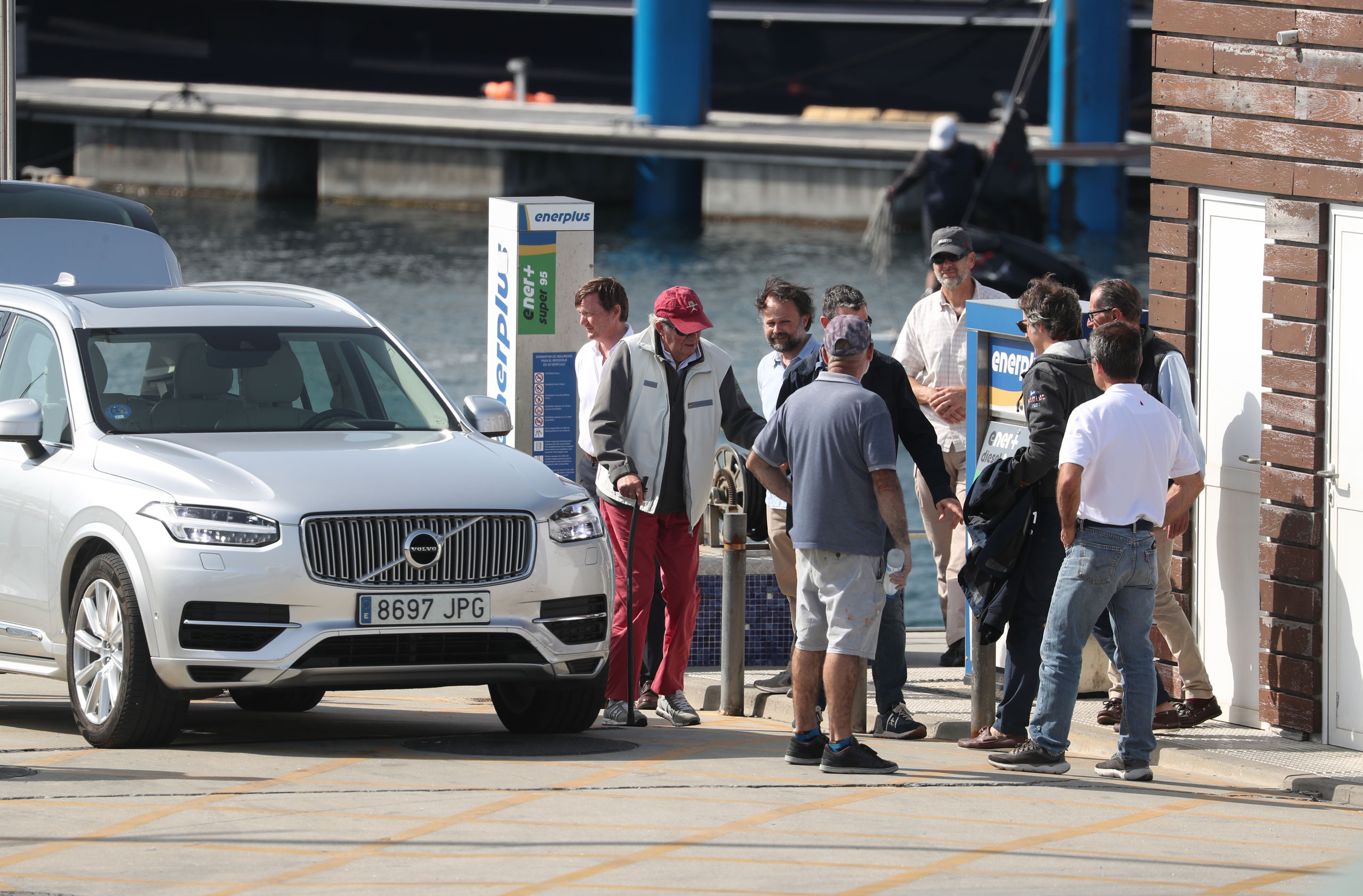 Antes de viajar de copiloto en el vehículo particular del regatista Pedro Campos, su amigo y anfitrión durante su estancia en Sanxenxo, pues se aloja en su chalet, el padre de Felipe VI, después de atracar en el pantalán, se ha parado con unas personas a hablar de manera breve.