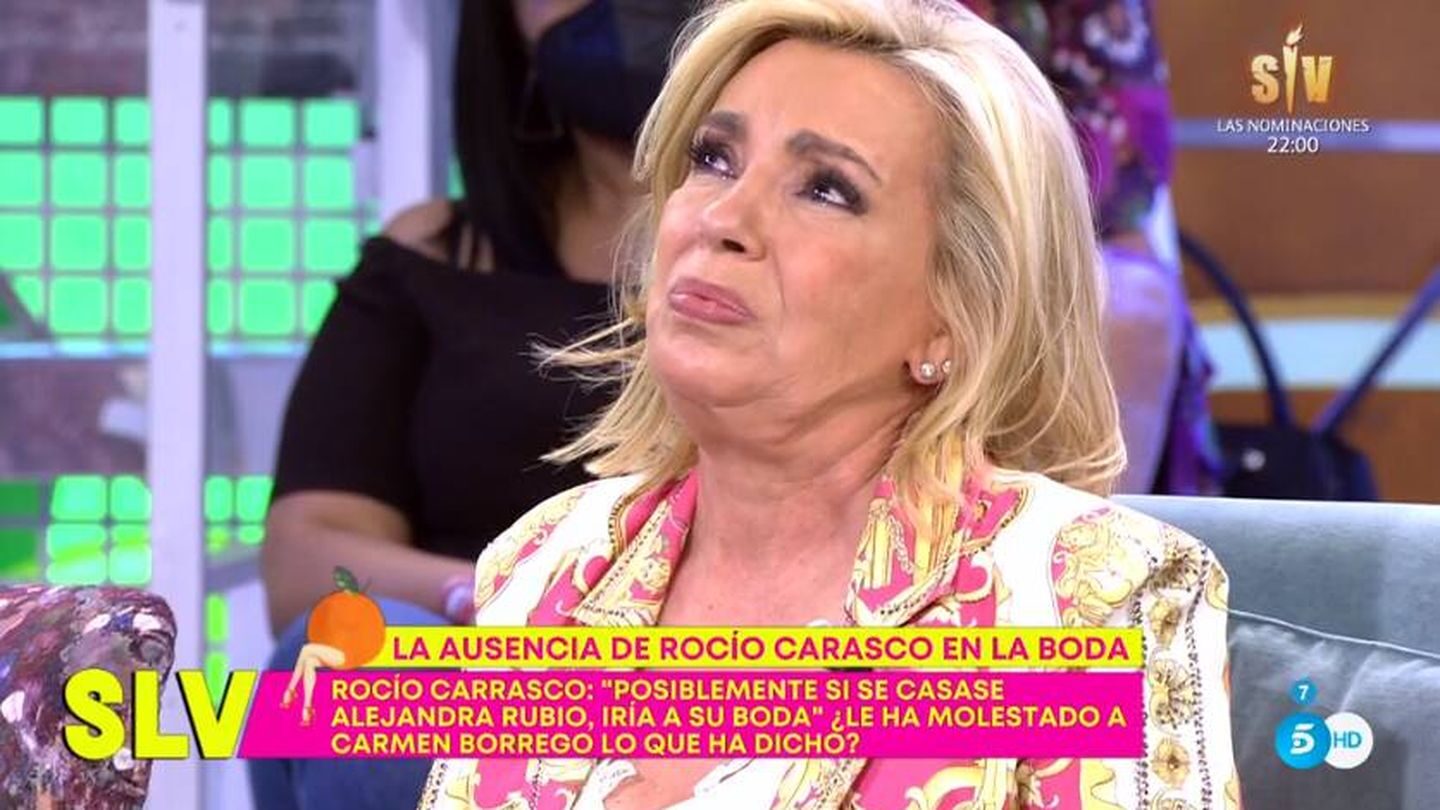 Rocío Carrasco llamó en directo al programa para aclarar que no va a hablar más sobre la boda del hijo de su amiga ya que "dio las explicaciones a las personas a las que se las tenía que dar". "La verdadera hermandad se demuestra cuando hay un problema, no yendo a una boda. Hay veces que se puede, hay veces que no se puede", dijo la hija de Rocío Jurado ante una tensa Carmen Borrego. La presentadora María Patiño realizó una pregunta que terminó por hundir a la colaboradora: "¿Si se casa Alejandra Rubio, irías a su boda?". "Si las circunstancias fuesen las adecuadas, seguramente iría a la boda a de Alejandra o a la de la hija de Carmen", respondió.