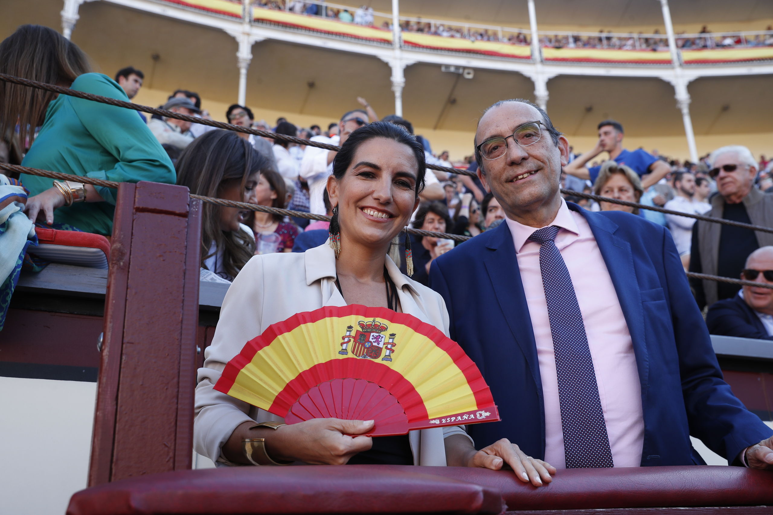 Rocío Monasterio con su inseparable abanico de España sonríe ante los medios en la plaza de toros de Las Ventas.