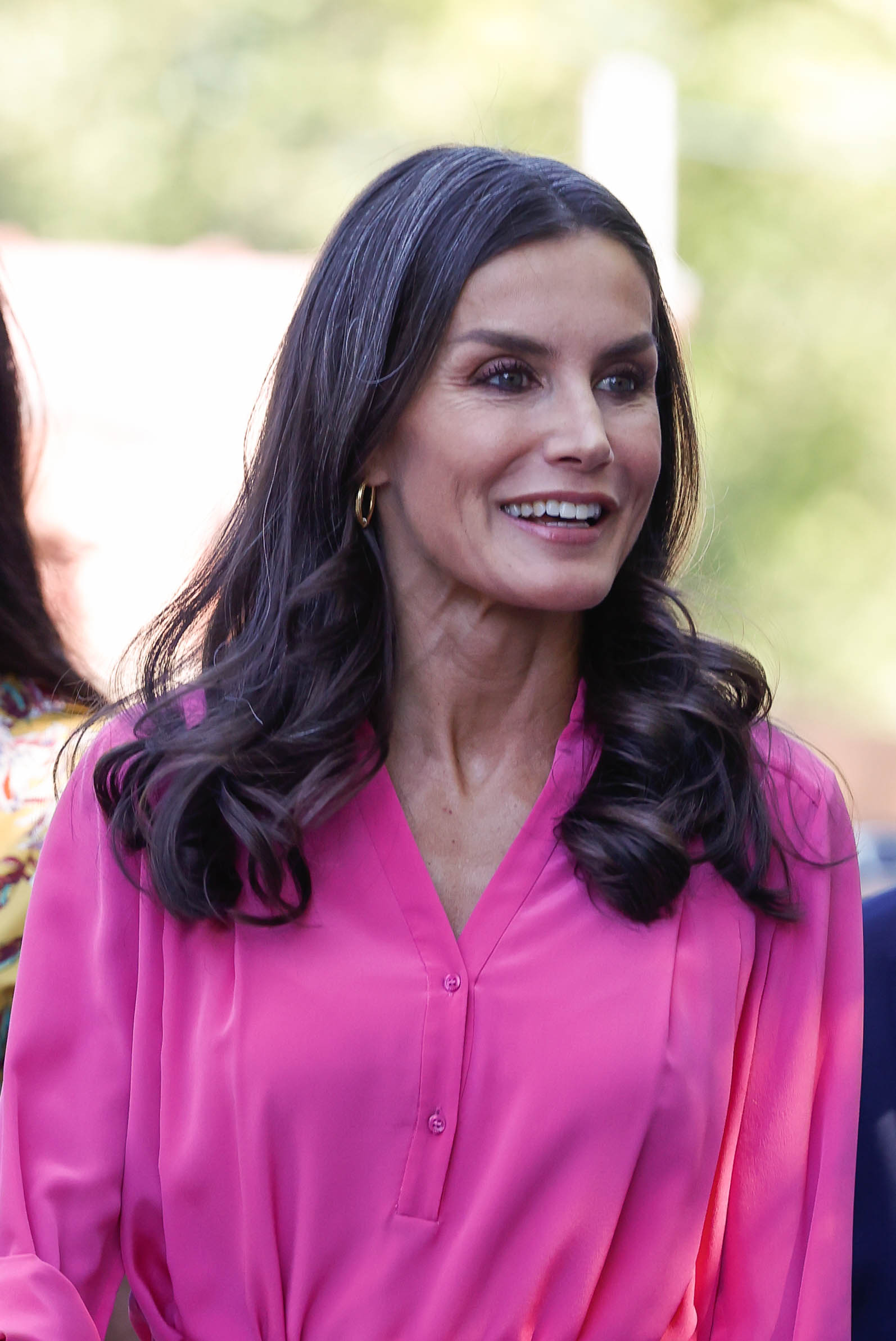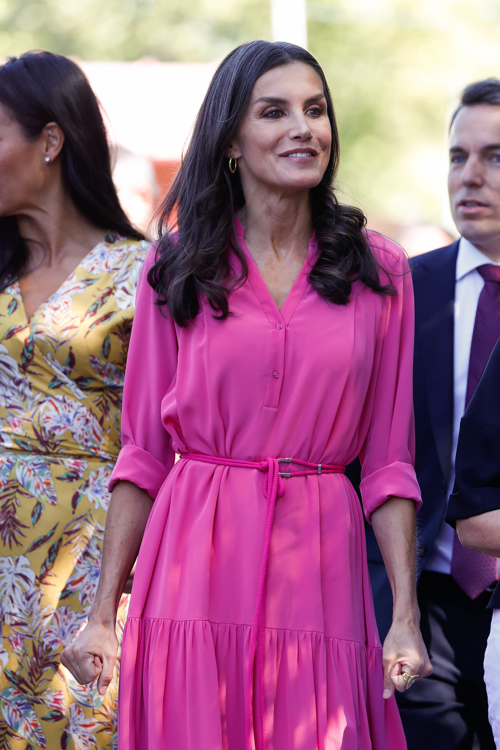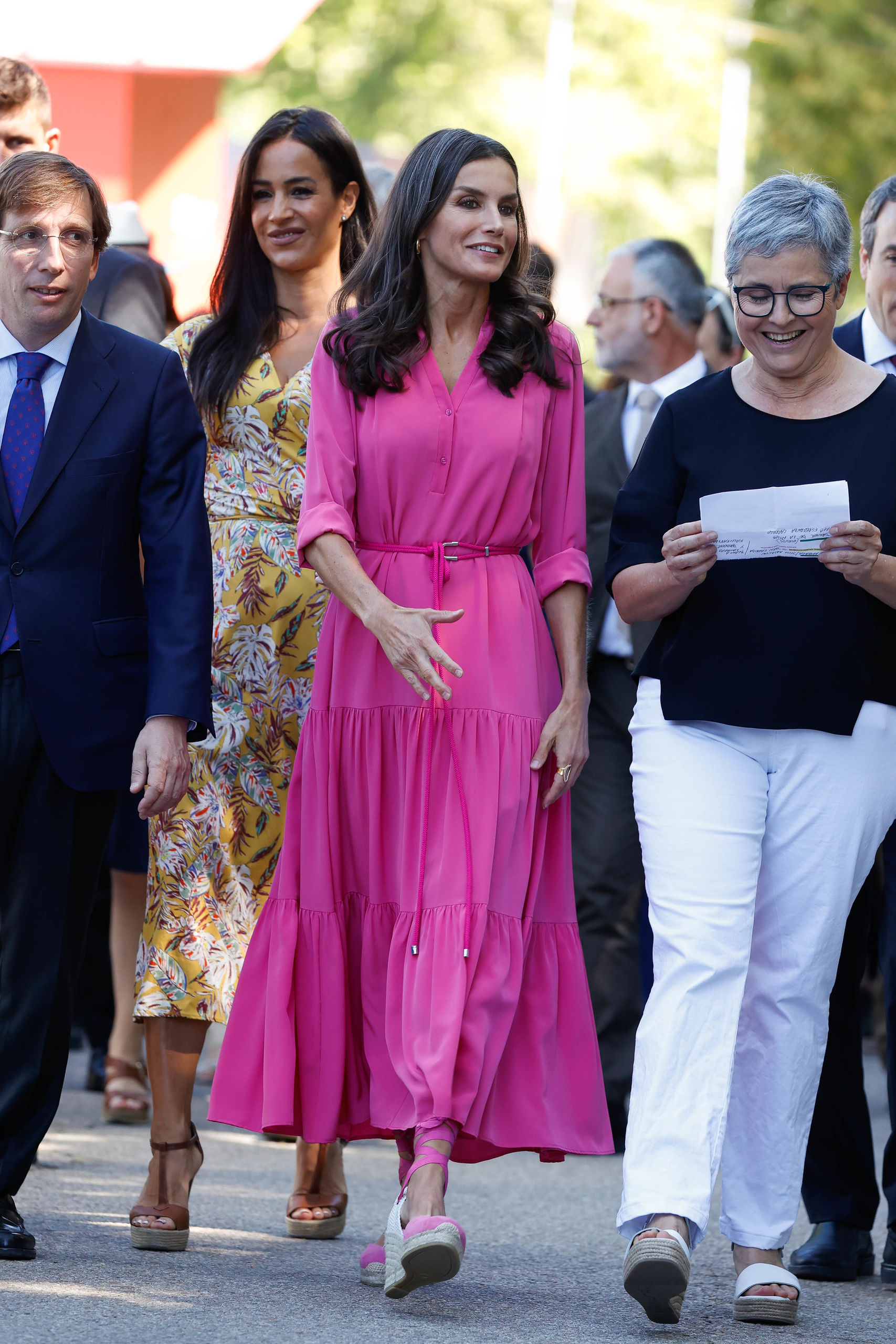 La monarca se olvidó de los tacones y se enfundó unas cómodas alpargatas de cuña a juego con el vestido en color rosa. Muy sencilla, como joyas solo escogió unos sencillos aros dorados.
