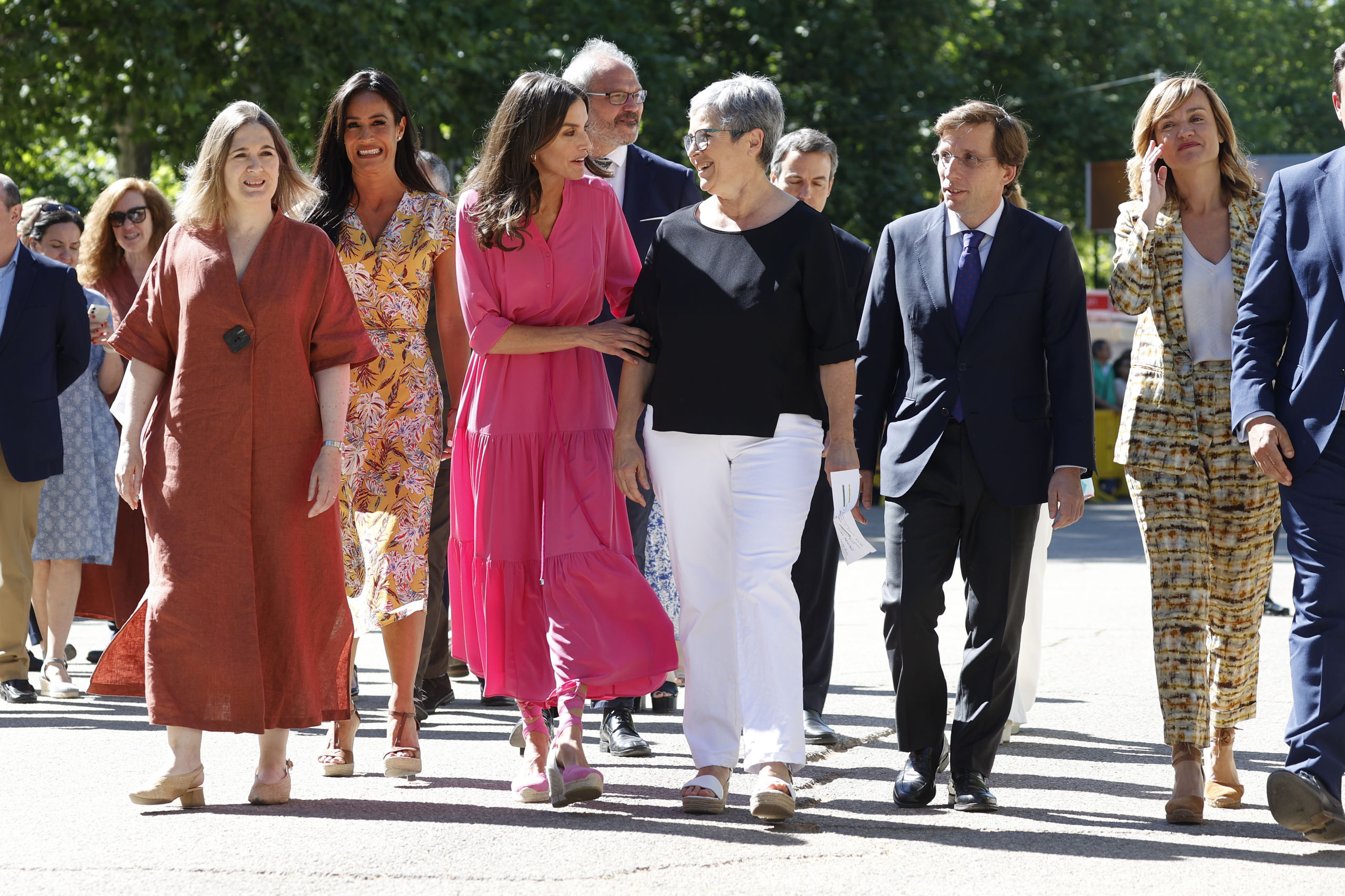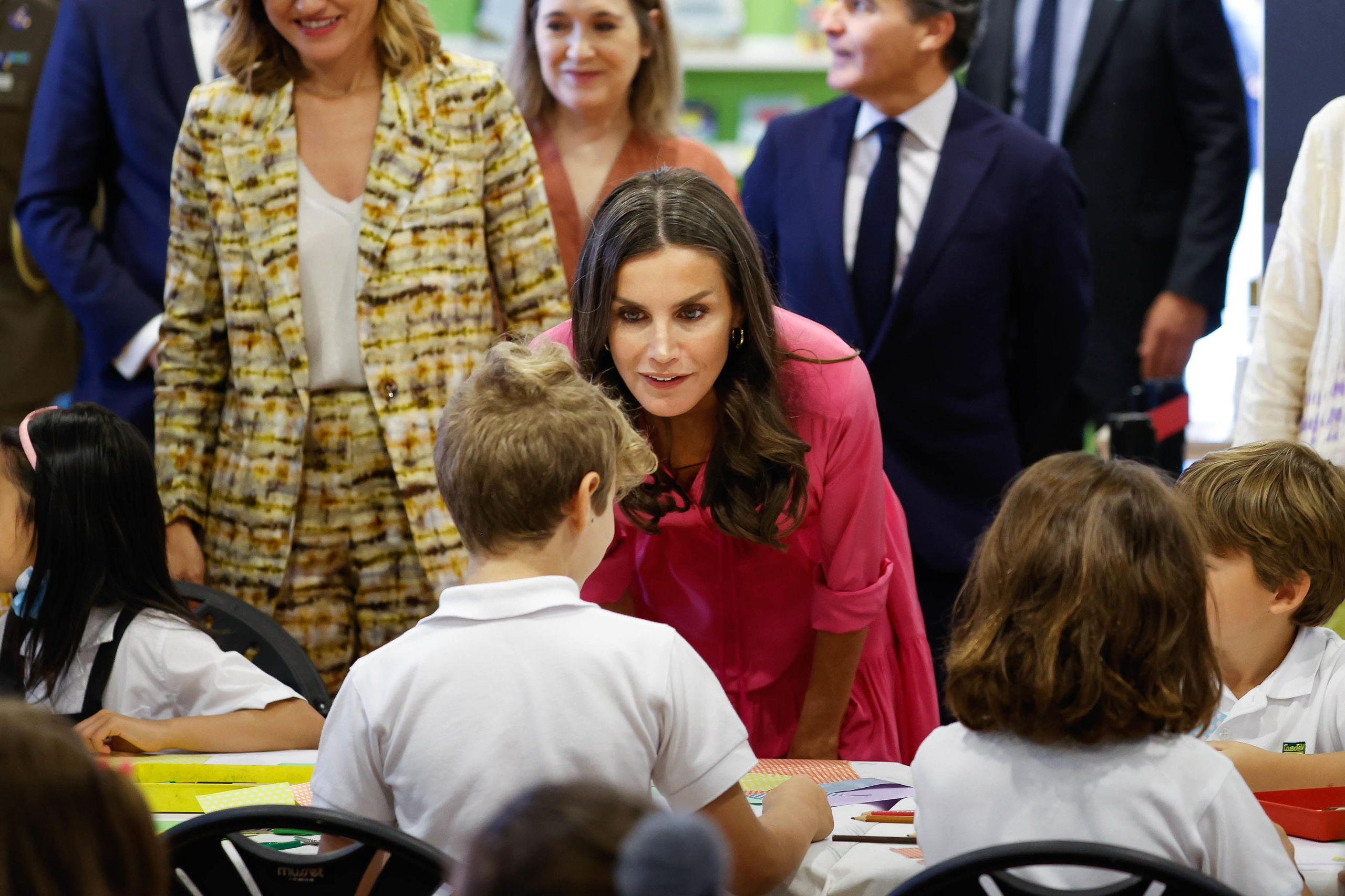 Acompañada por la ministra de Educación y Formación Profesional, Pilar Alegría, y la directora de la Feria del Libro de Madrid, Eva Orúe, la Reina se paró a charlar con unos niños.