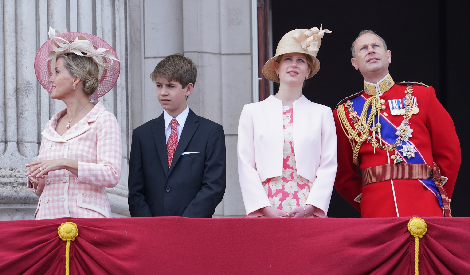 El príncipe Eduardo, hijo menor de la Reina, su mujer Sofía de Wessex, y sus hijos Louise y Jacob, en el balcón de palacio. No hubo rastro de su hermano, el príncipe Andrés, que aún sufre las consecuencias de su escándalo sexual con una menor de edad.