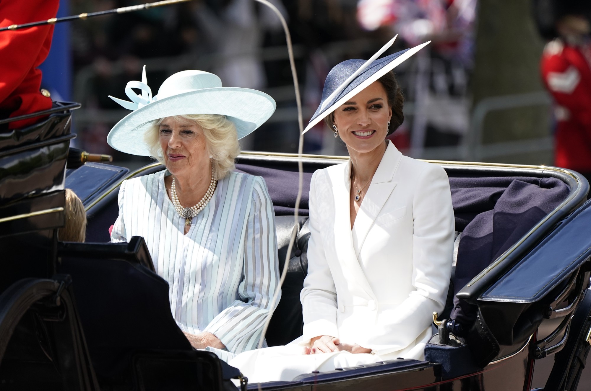 Camila, la duquesa de Cornualles, y Kate, esposa de Guillermo y duquesa de Cambridge, desfilaron en carroza junto con sus tres hijos. Una vez, la exquisita elegancia de Kate Middleton acaparó las miradas. Vestida con un diseño tipo abrigo en blanco de Alexander McQueen, lo combinó con un sombrero del diseñador británico Philip Treacy. Una vez más, la duquesa de Cambridge le dedicó un guiño a la princesa Diana de Gales rescatando unos pendientes de perlas y zafiros que lució durante su célebre baile con el actor John Travolta en 1985 en uno de los salones de la Casa Blanca.