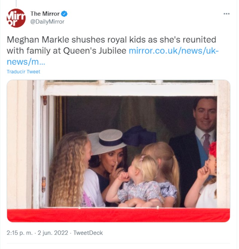 A pesar de que no estuvo en la foto oficial, la prensa británica captó a Meghan Markle divirtiéndose en la parte de atrás. El diario inglés The Mirror publicó una simpática imagen de la ex actriz con las niñas.