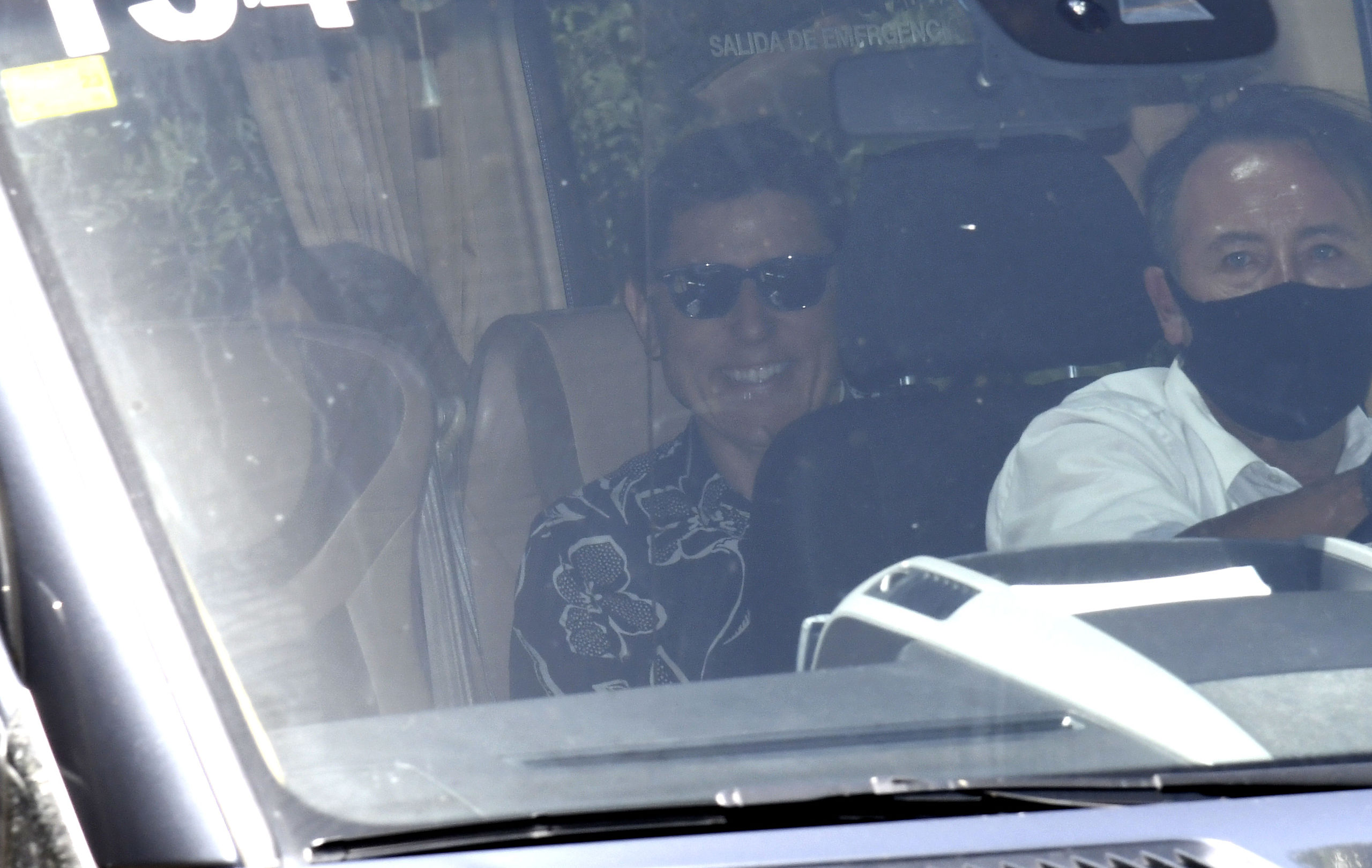 Manel Fuentes, muy sonriente sonriendo desde el coche que le llevó a la finca.