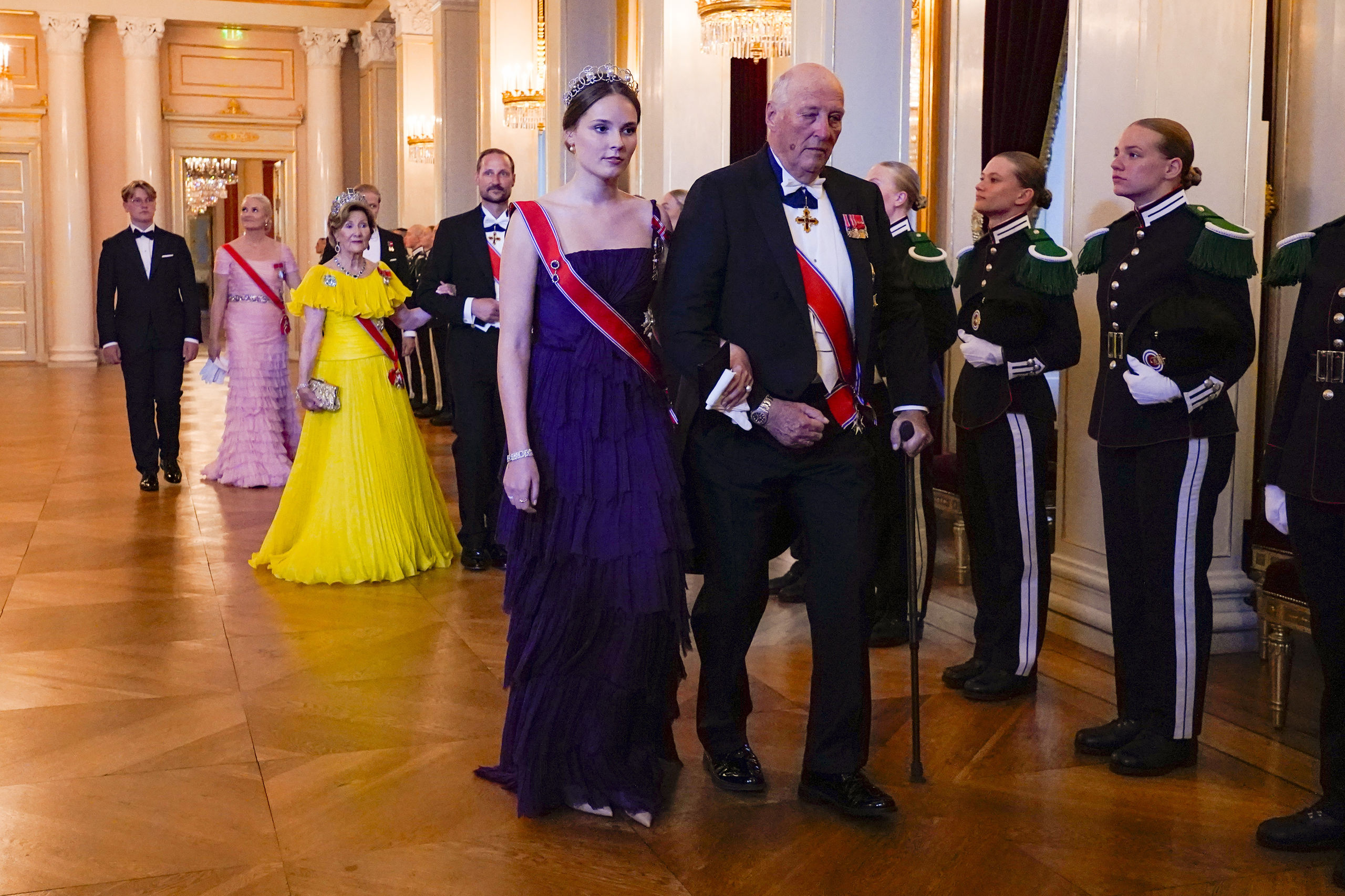 El príncipe Haakon escucha atento el discurso de su hija, la princesa Ingrid, durante la cena de gala celebrada en su honor este viernes en el palacio real de Oslo. .