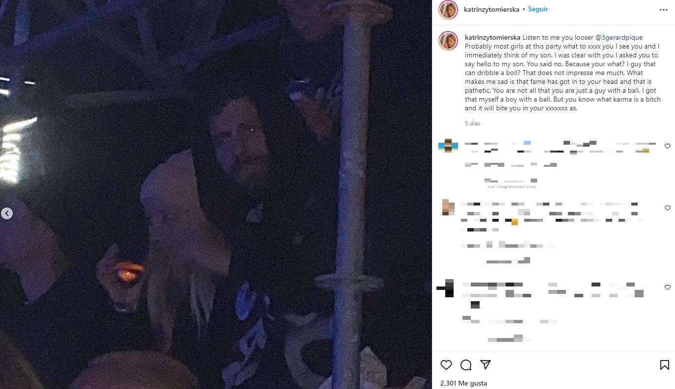 Vestido con una simple sudadera, Piqué fue fotografiado junto a una joven rubia, pero no lo hizo ningún papparazzi, sino una conocida empresaria sueca con la que no fue del todo simpático. Katrin Zytomierska, propietaria de la cadena de restaurantes Clean Eating, publicó en Instagram una fotografía de Piqué y esta mujer en la fiesta con la intención de denunciar públicamente lo grosero que fue con ella.