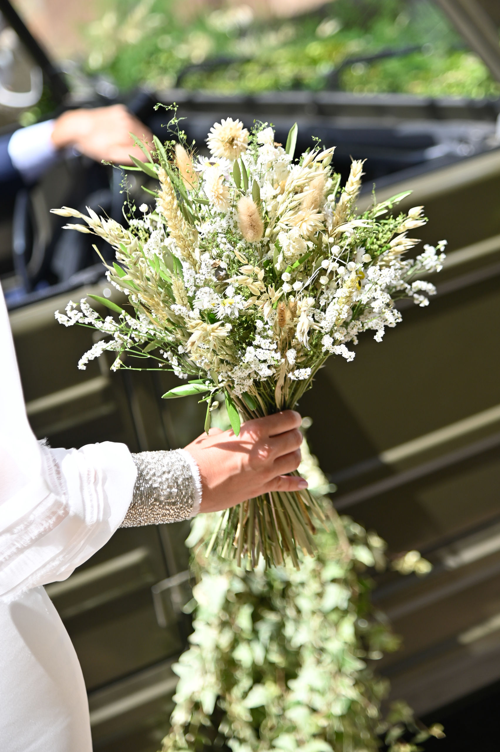 Ha sorprendido llegando en un original coche nupcial, un vehículo de estilo militar de la Cruz Roja. Llevaba el cabello recogido en un original peinado trenzado y posaba a las puertas del templo junto a su orgulloso padre, Víctor Pombo.