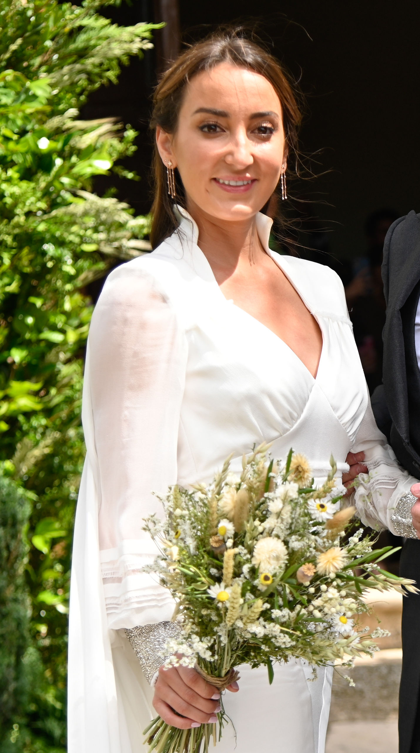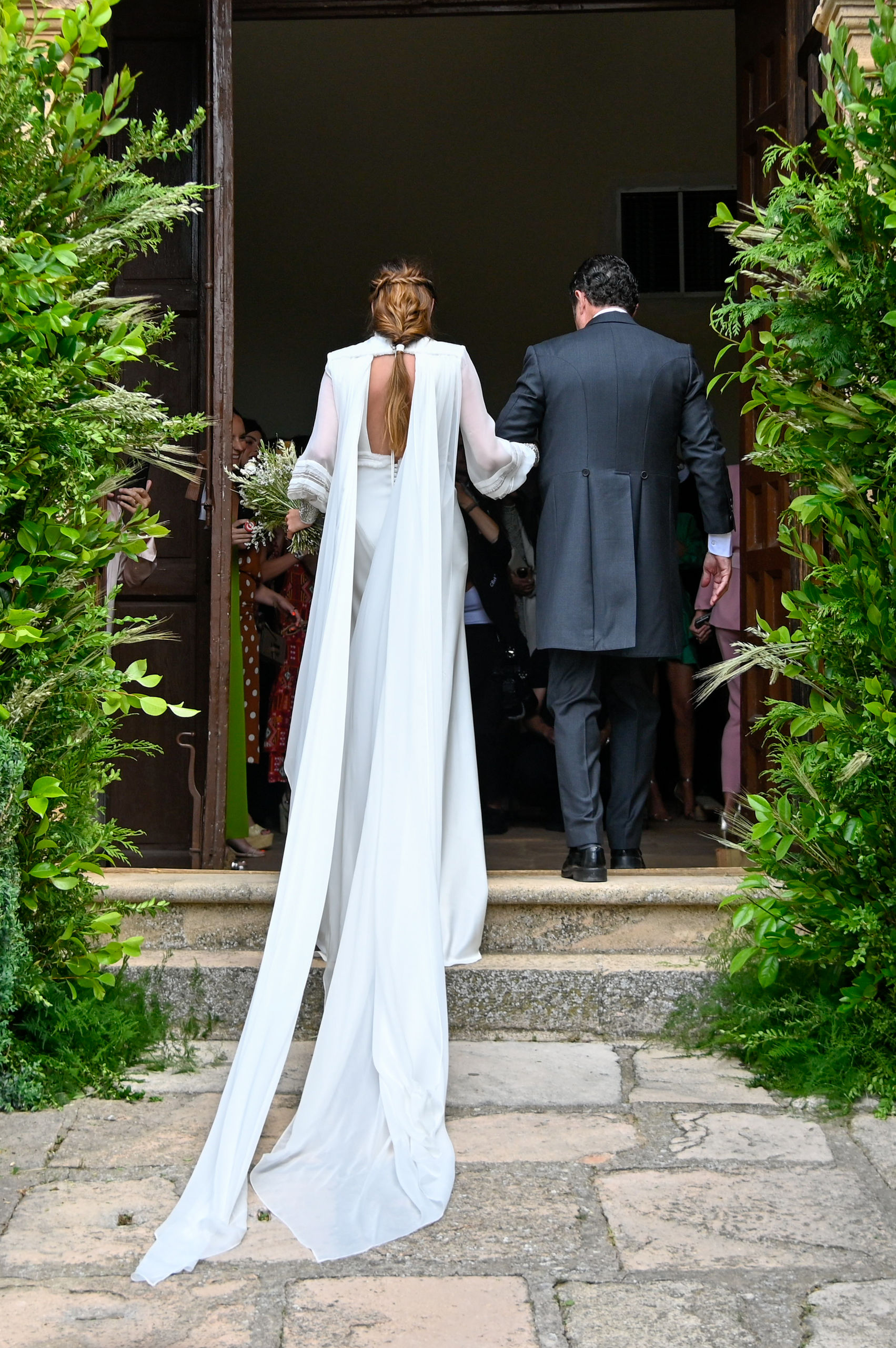 La novia ha apostado por un diseño de Inuñez (la marca de la diseñadora Isabel Núñez), que ha optado por un estilismo con capa blanca muy larga a modo de velo y por delante con un corte cruzado y cuello subido.