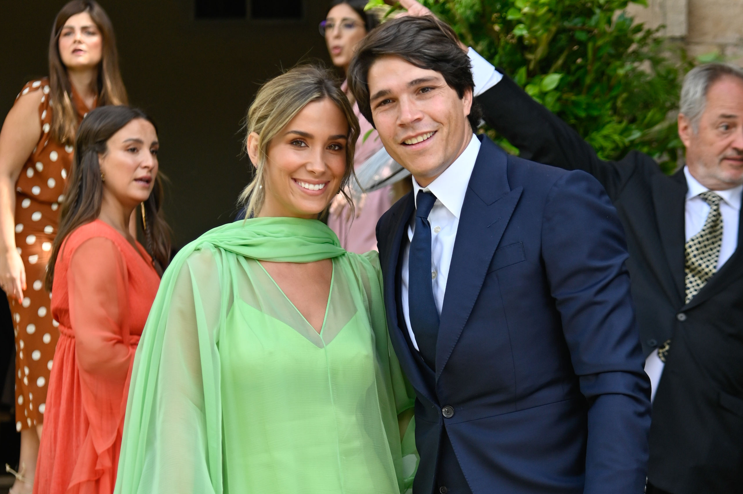 La hermana de la novia, María Pombo, ha lucido un diseño estilo túnica con capa en color verde. En la imagen, junto a su marido Pablo Castellano.