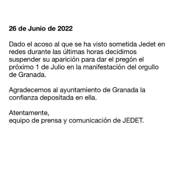 "Dado el acoso al que se ha visto sometida Jedet en redes durante las últimas horas, decidimos suspender su aparición para dar el pregón en la manifestación del Orgullo de Granada. Agradecemos al Ayuntamiento la confianza depositada en ella", reza el mensaje publicado en Instagram.