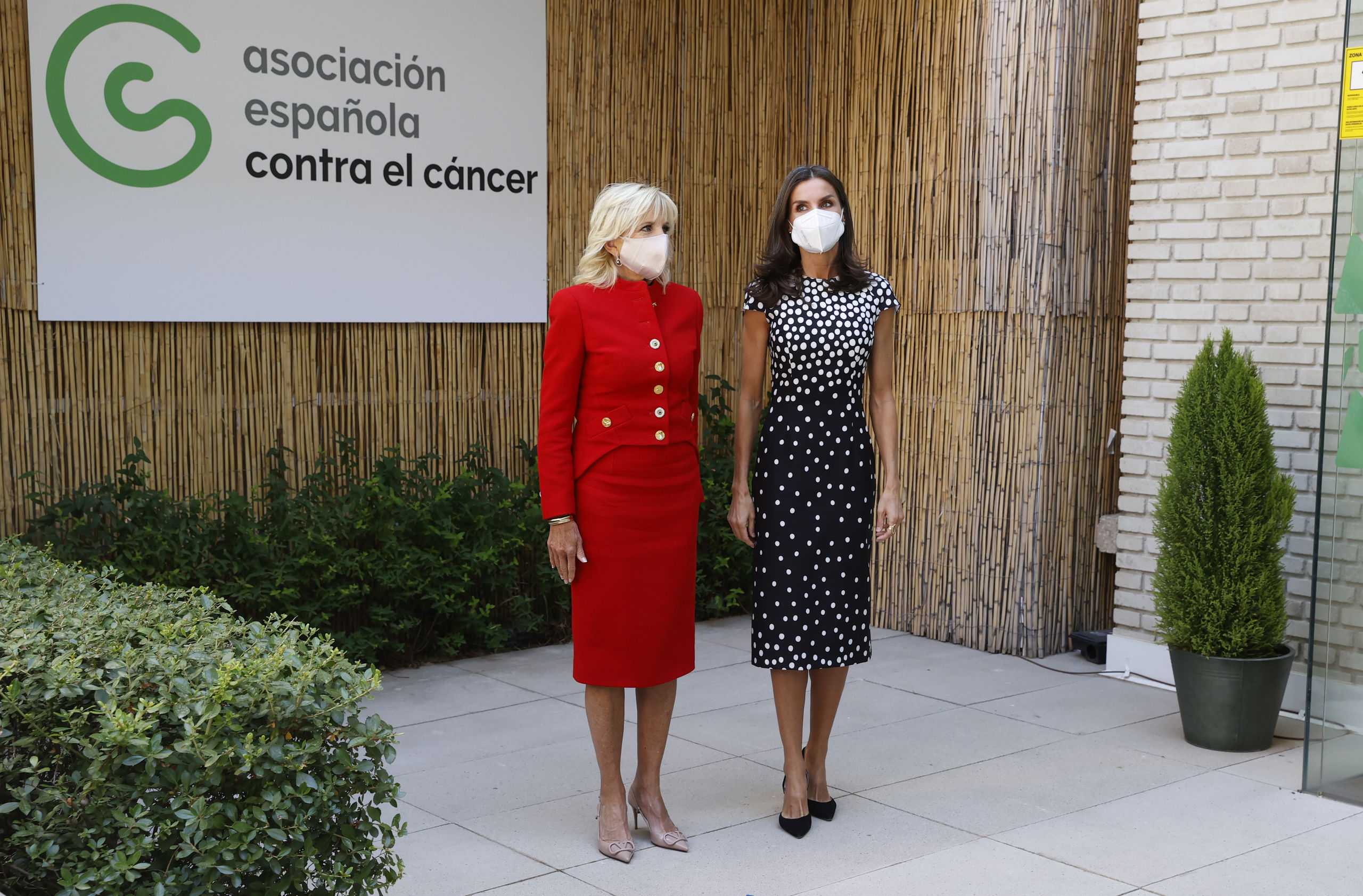 Tras su encuentro en la Zarzuela, la reina y Jill Biden se han desplazado a la sede de la Asociación Española contra el Cáncer (AECC) para conocer la tarea que esta entidad desarrolla contra la enfermedad.