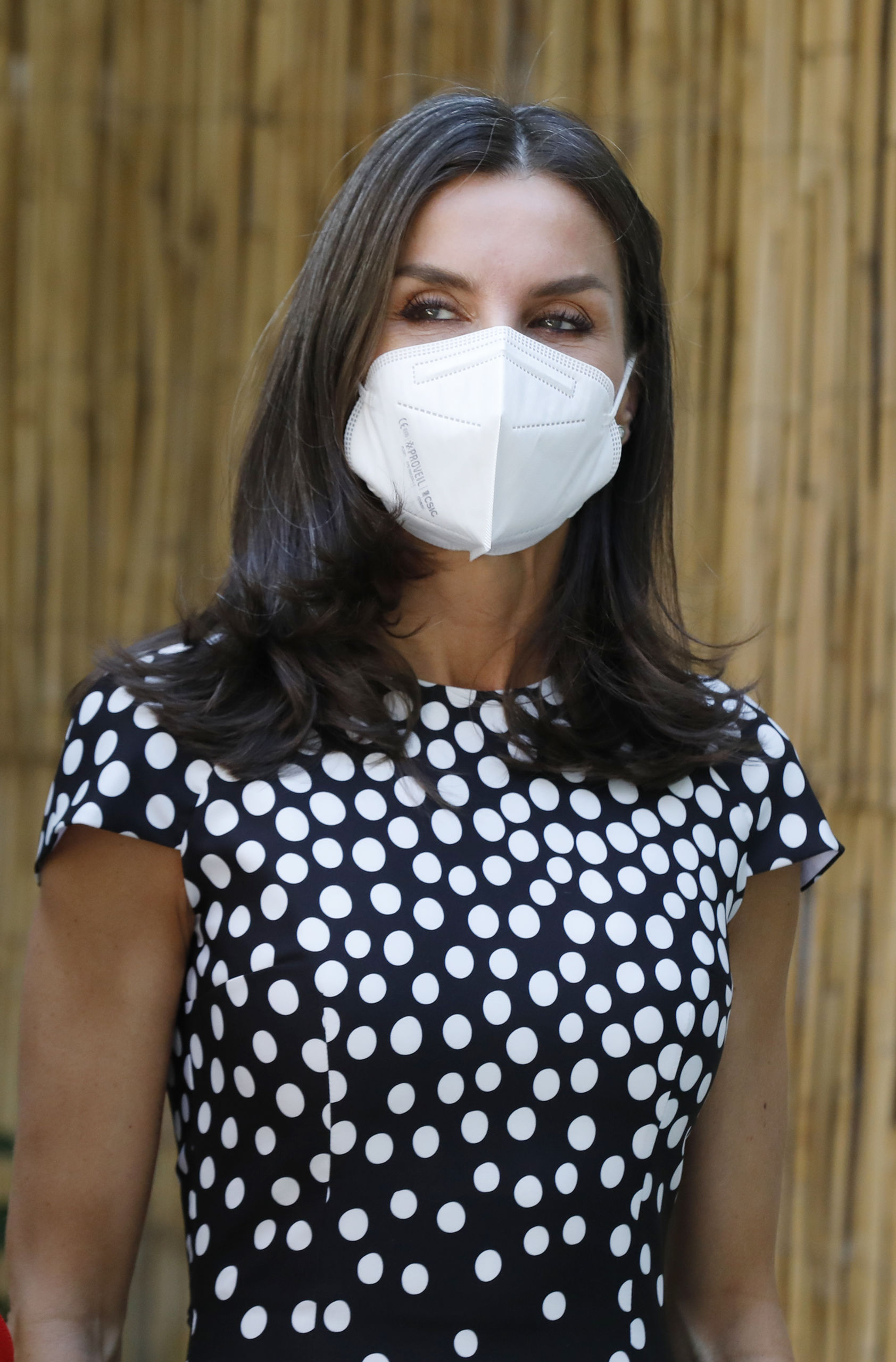 En esta ocasión especial, la Reina estrenó vestido del diseñador sevillano José Hidalgo. Se trata de un diseño negro con lunares blancos en degradé, realizado en punto de seda, con manga corta y largo midi.