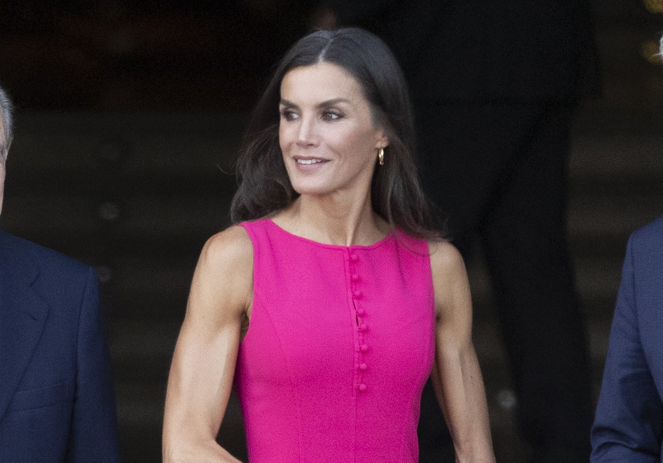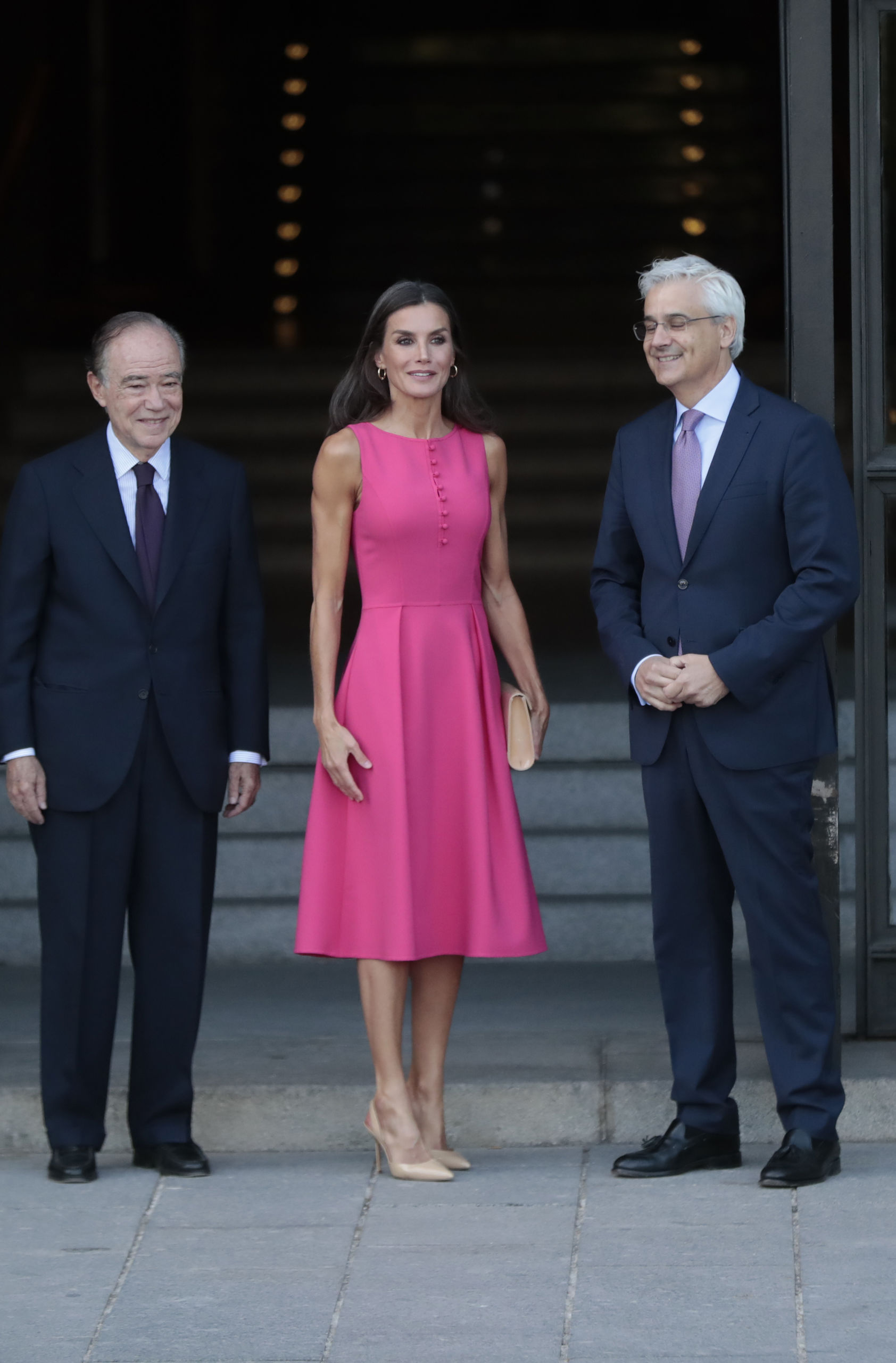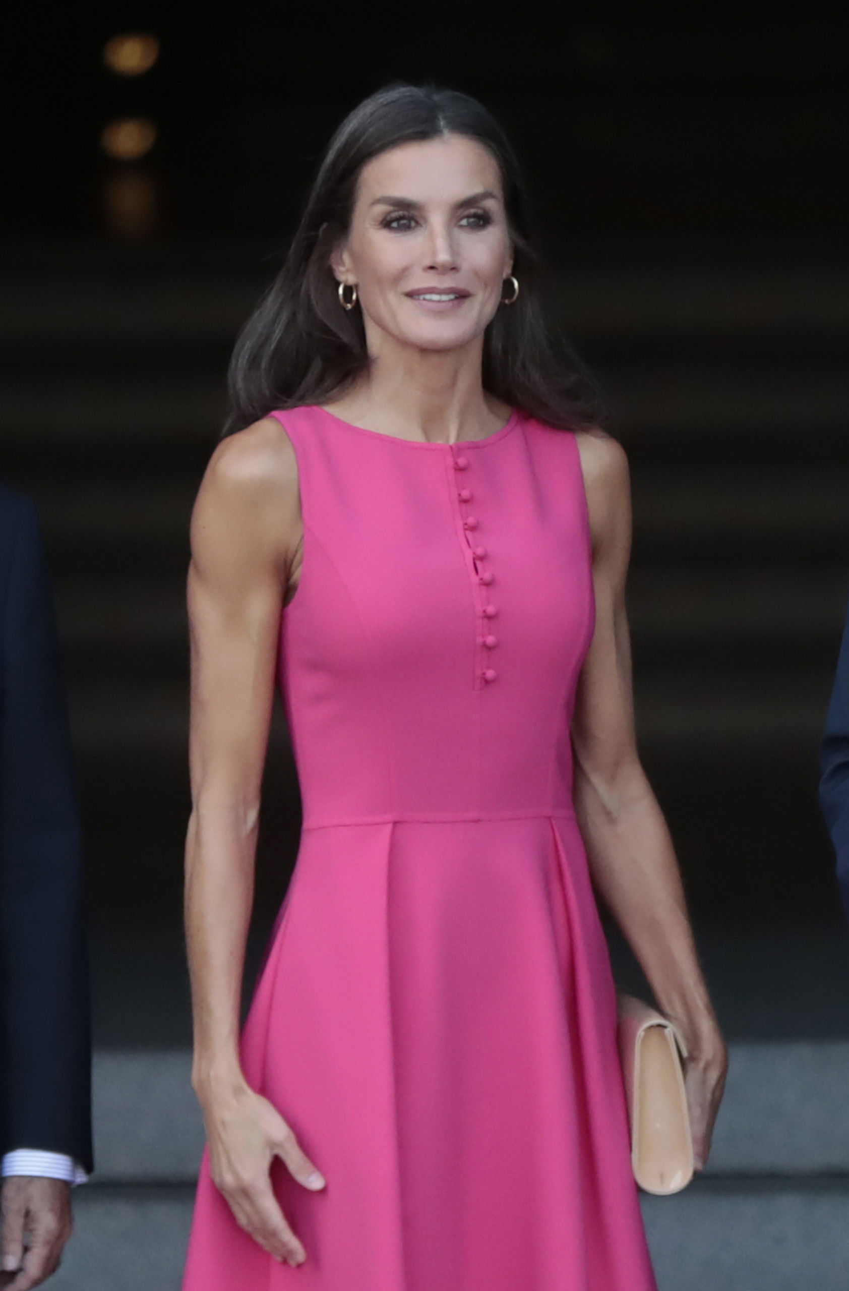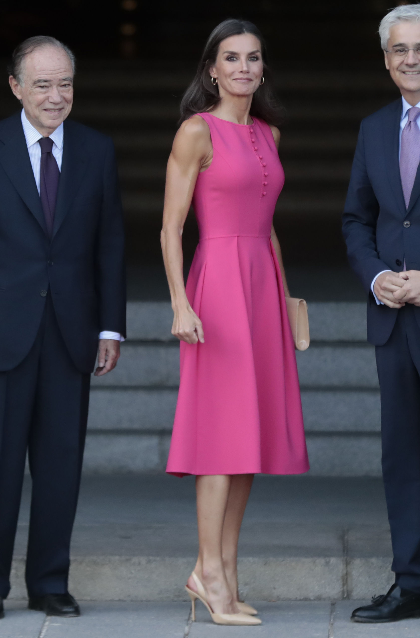 Para su última cita en el marco de la cumbre, Letizia rescató un vibrante vestido de su armario que estrenó durante una visita a Estados Unidos en 2018. Se trata de un diseño hecho a medida de Carolina Herrera, de color rosa fucsia brillante con escote redondo y botonadura, y falda de vuelo.