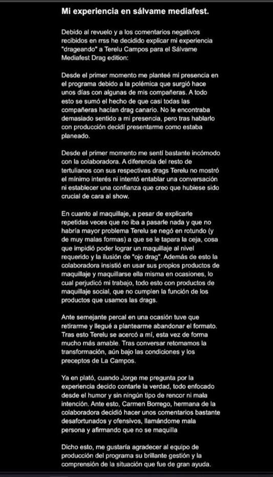 "Desde el primer momento me sentí bastante incómodo con la colaboradora. Terelu no mostró ni el mínimo interés, ni intentó entablar una conversación ni establecer una confianza que hubiese sido crucial de cara al show. En cuanto al maquillaje, Terelu se negó en rotundo (y de muy malas formas) a que se le tapara la ceja. Además la colaboradora insistió en usar sus propios productos de maquillaje y hacerlo ella misma, lo que dificultó mi trabajo. Ante semejante percal en una ocasión tuve que retirarme y llegué a plantearme abandonar el formato. Tras conversar, retomamos la transformación, aún bajo las condiciones y preceptos de las Campos", ha escrito la drag, destapando el temperamento de Terelu fuera de cámaras.