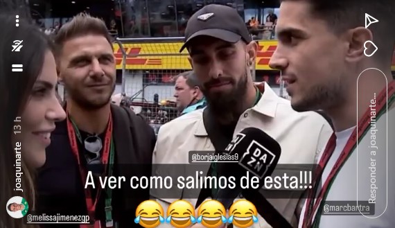 Muy profesional, Melissa se interesó por sus sensaciones antes de que comenzara la carrera y a su ex le preguntó por la reciente victoria en Inglaterra del piloto de Ferrari. "La verdad es que que esté ahí Carlos es un orgullo para todos. Para el país es muy importante. Muy contentos también de haber podido estar con él, ojalá pueda ganar", dijo mientras Joaquín y Borja trataban de contener la risa.