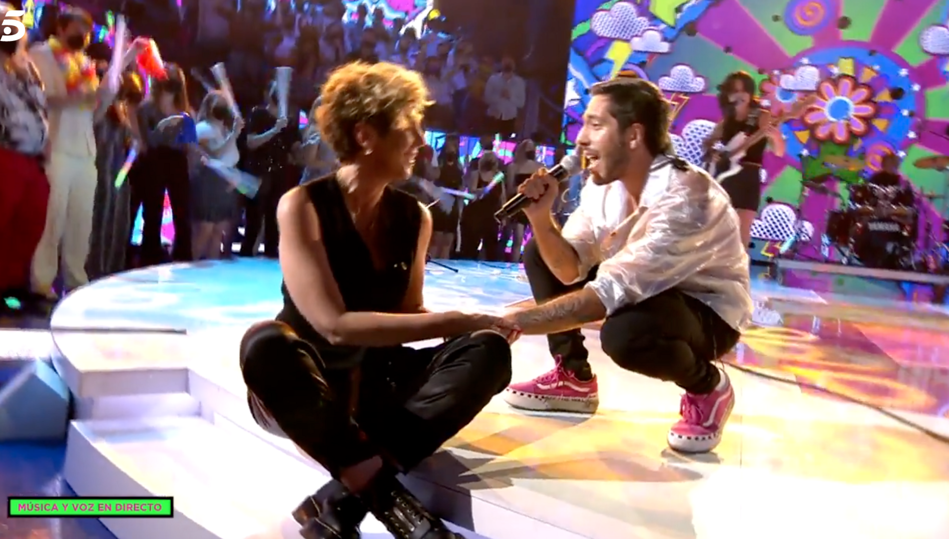 La heredera universal de Rocío Jurado no dudó en mostrar su complicidad con Mateo, a quien calificó como uno más de su "familia" (algo que supo "en cuanto lo vio"), cantando y bailando con él e incluso dándole la mano durante la actuación.