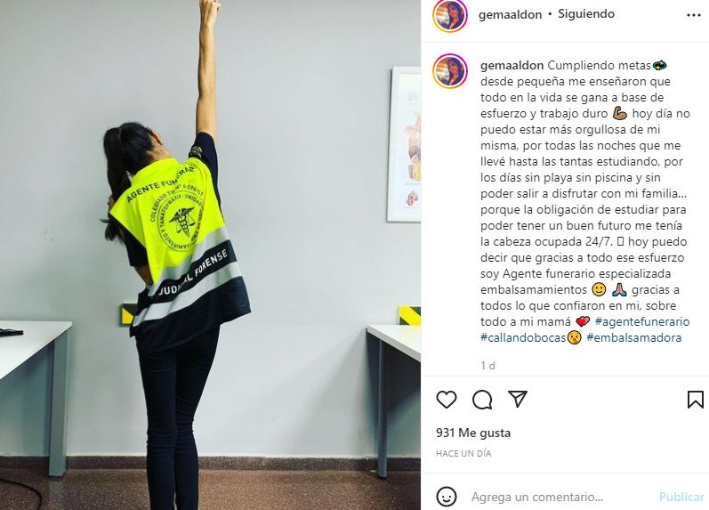 Gema, sin embargo, no tiene intención de publicitarse en los medios. Precisamente estos días ha celebrado en redes sociales su logro laboral: es por fin agente funeraria especializada en embalsamamientos. La hija de Ana María Aldón, por tanto, no necesita en absoluto salir en los medios para mantenerse sino que tiene una carrera lograda por sus propios méritos.
