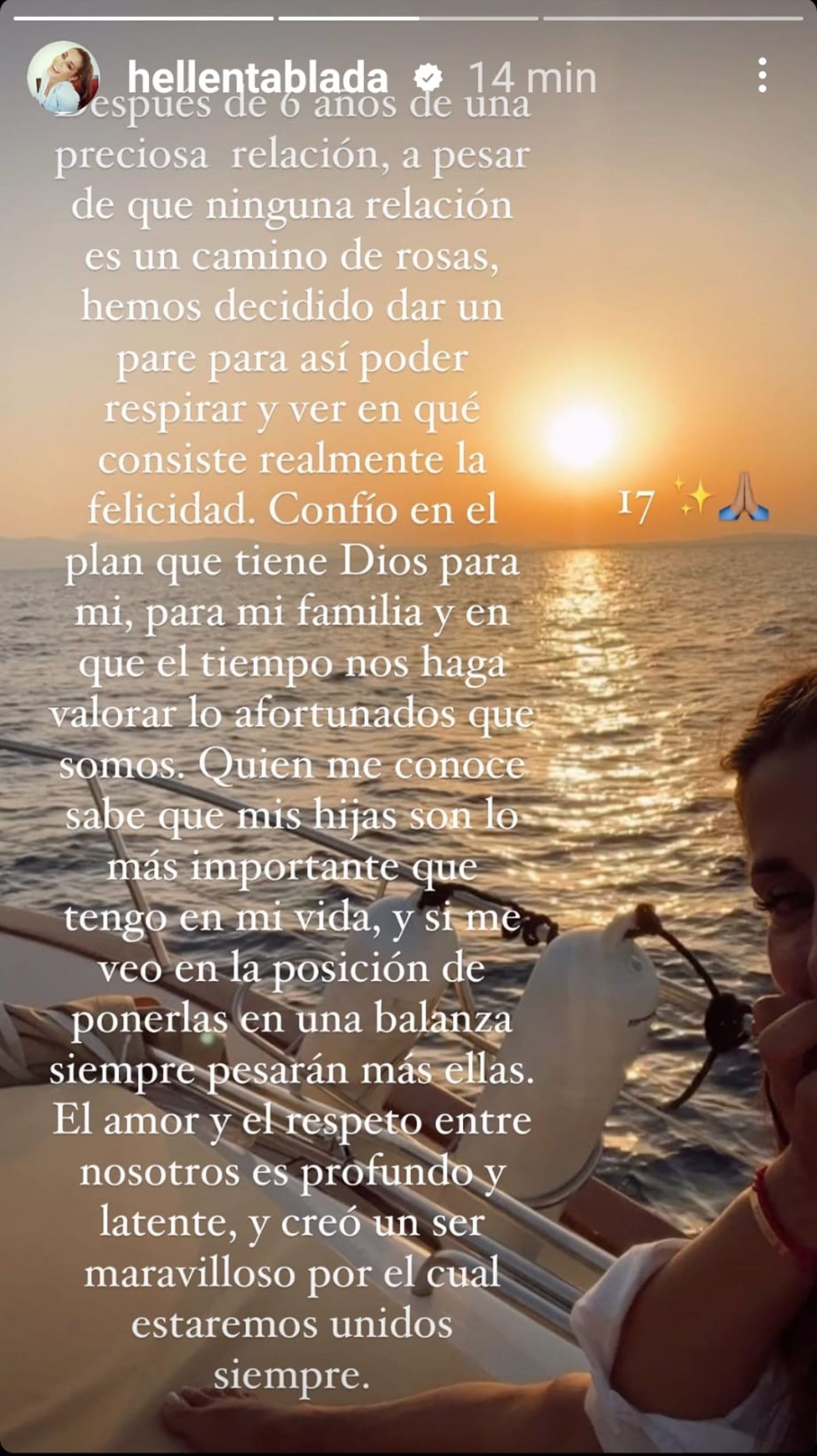 Pocas horas después, ha sido Elena Tablada la que ha roto su silencio a través de sus redes sociales con un mensaje en el que no solo confirma la noticia, sino que deja claro cuál es su prioridad en todo momento: "Después de seis años de una preciosa relación, a pesar de que ninguna relación es un camino de rosas, hemos decidido dar un pare [sic] para así poder respirar y ver en qué consiste realmente la felicidad".