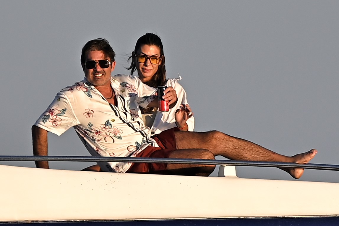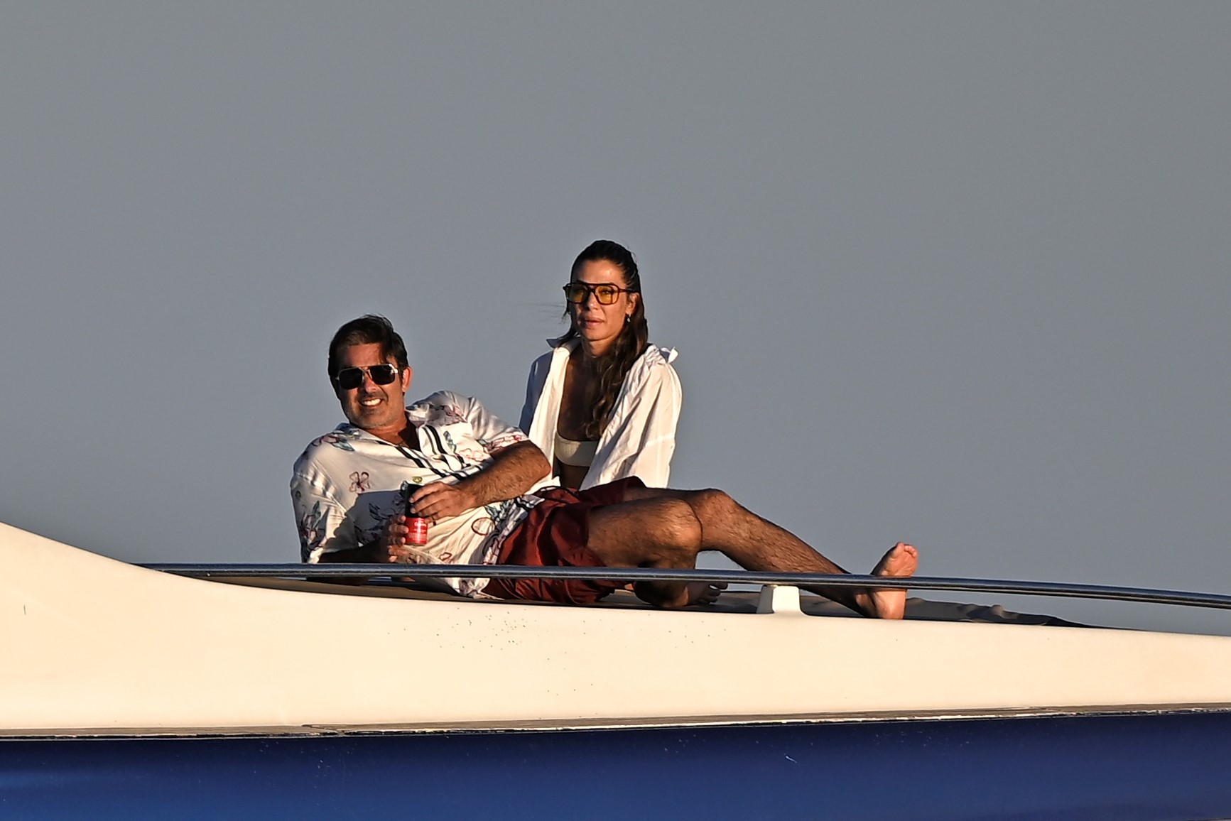 Al llegar a la embarcación, Elena y su acompañante no han dudado en separarse del resto del grupo y relajarse en la cubierta, tomando un poco el sol aprovechando él para beber algo y juntos. Para la ocasión, Elena destacó con conjunto de dos piezas de color beis, compuesto por bermudas y top ajustado.