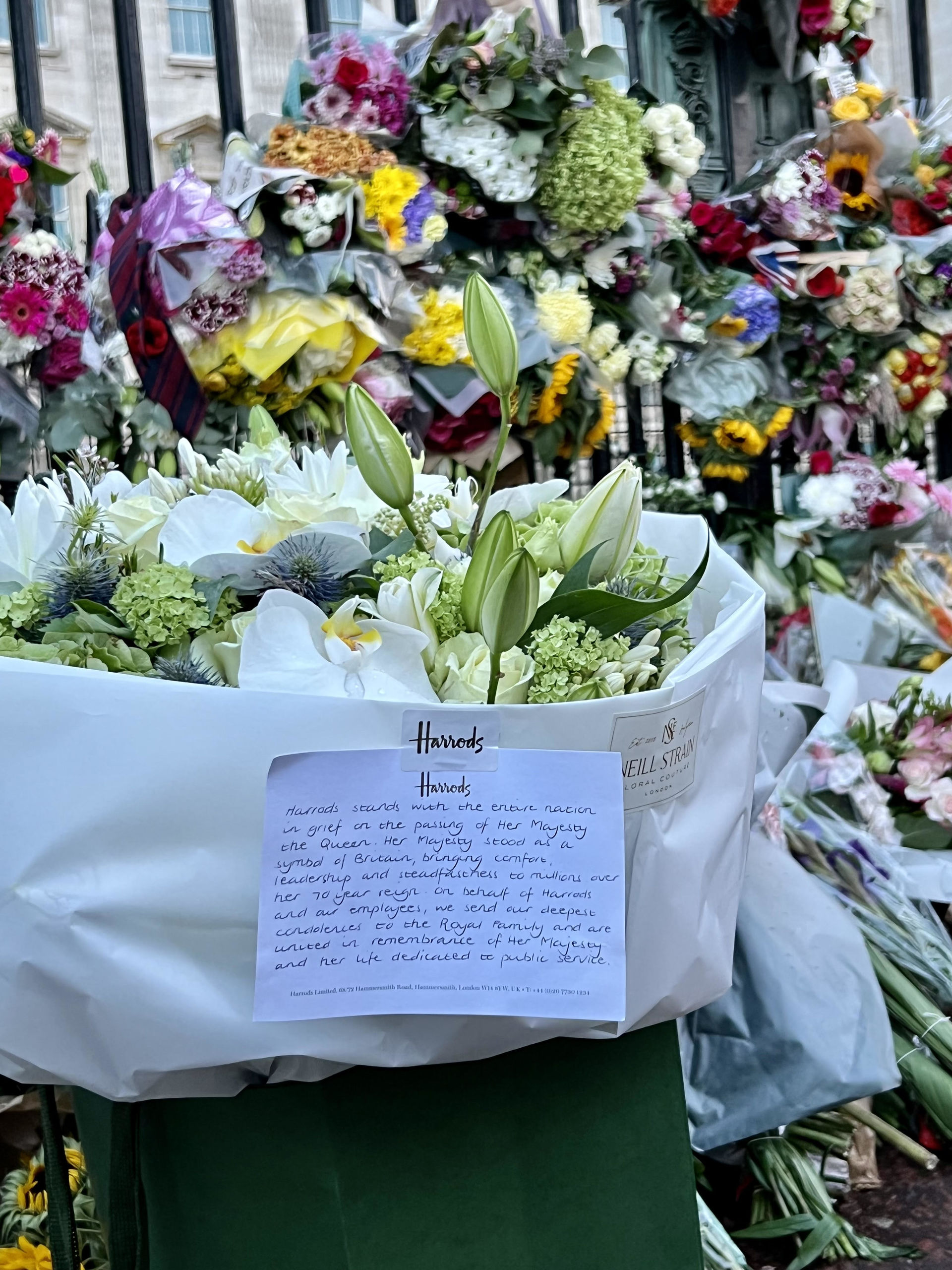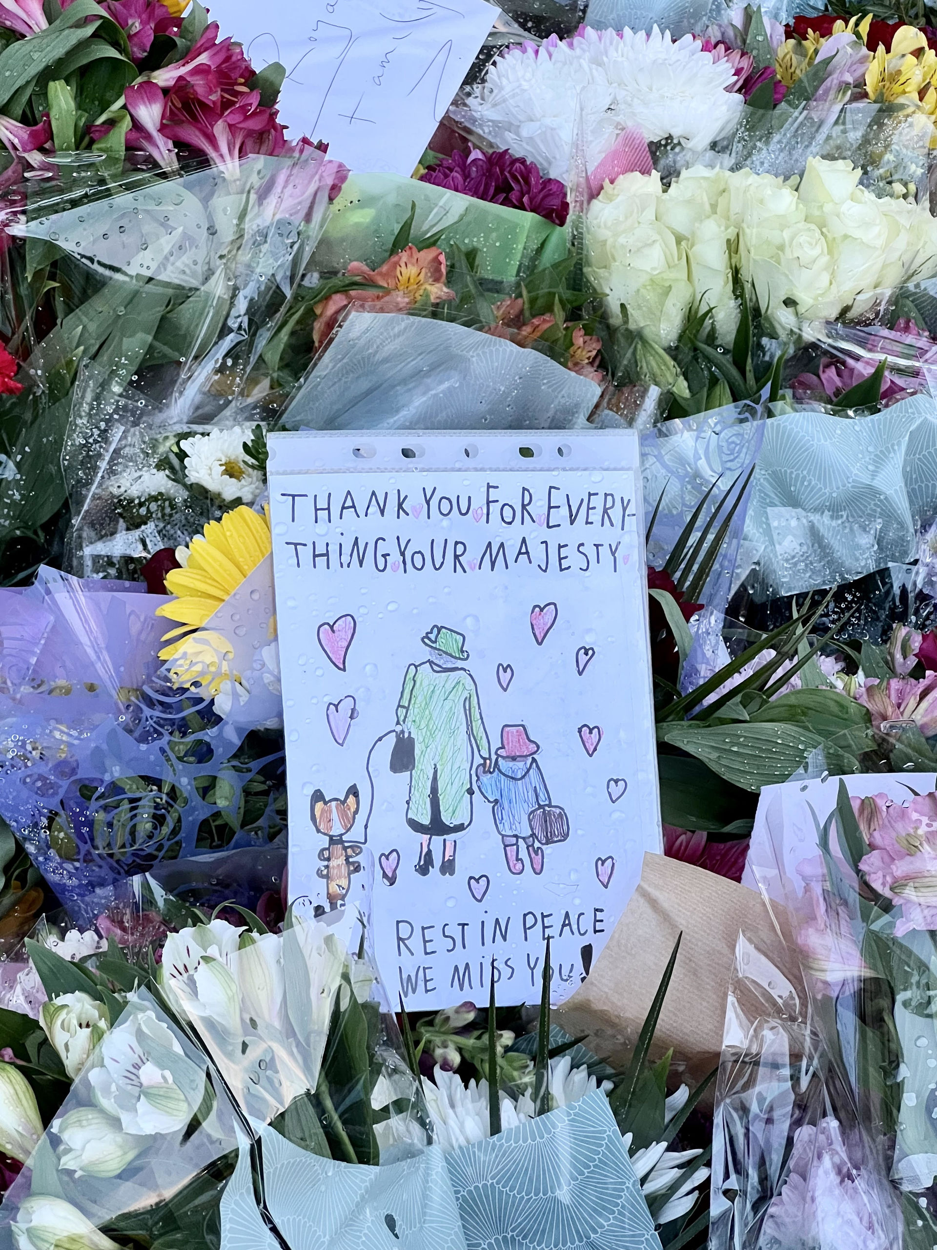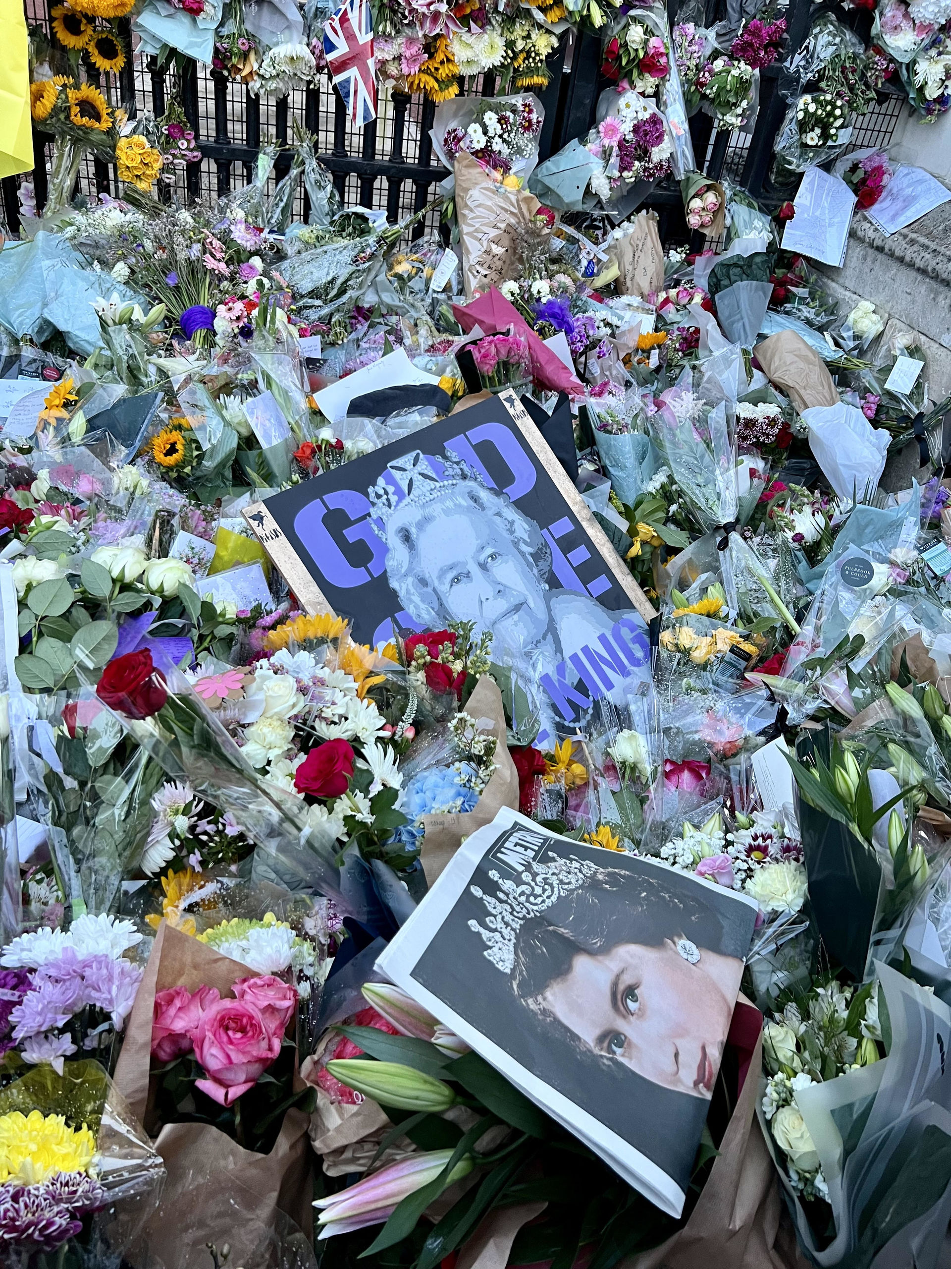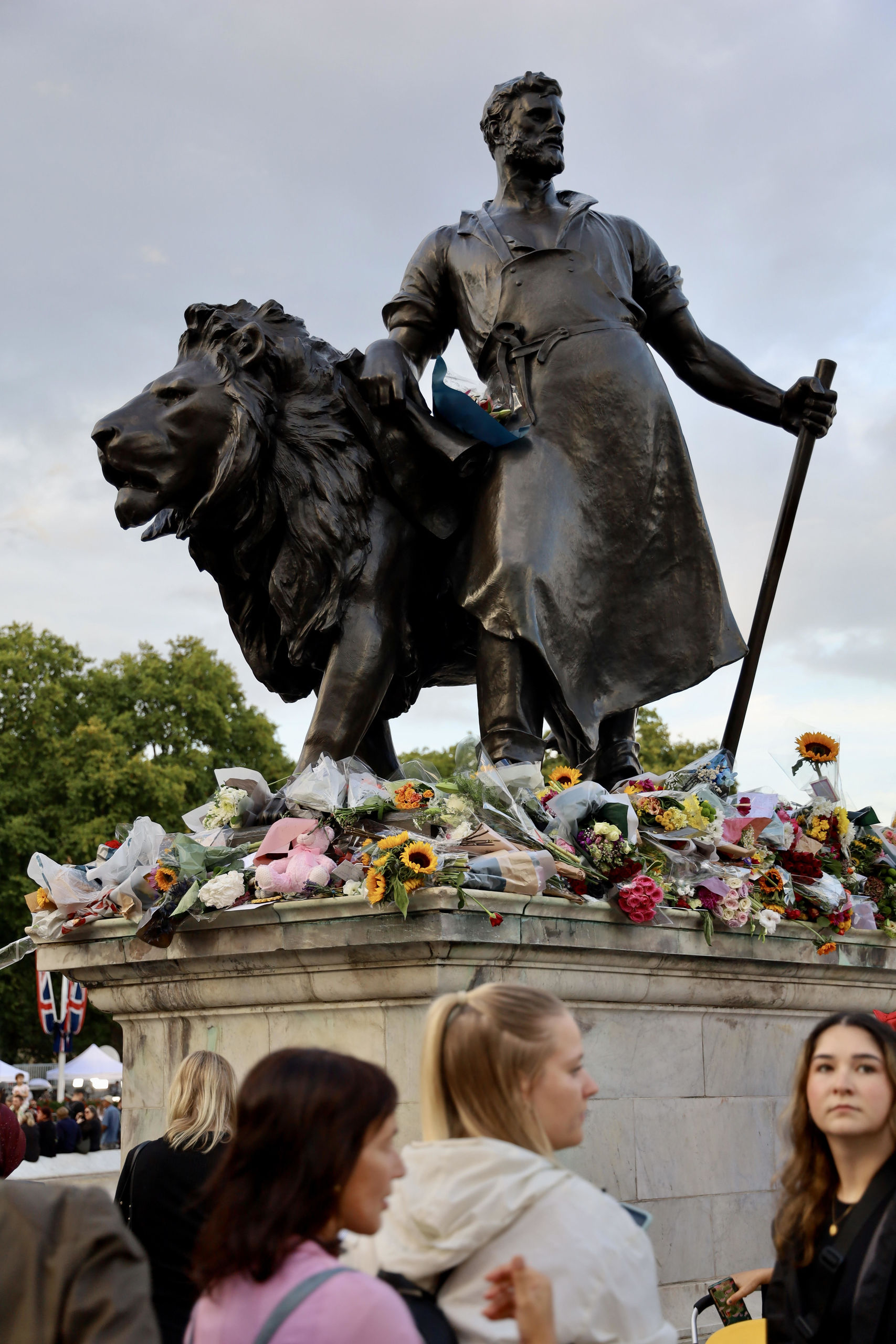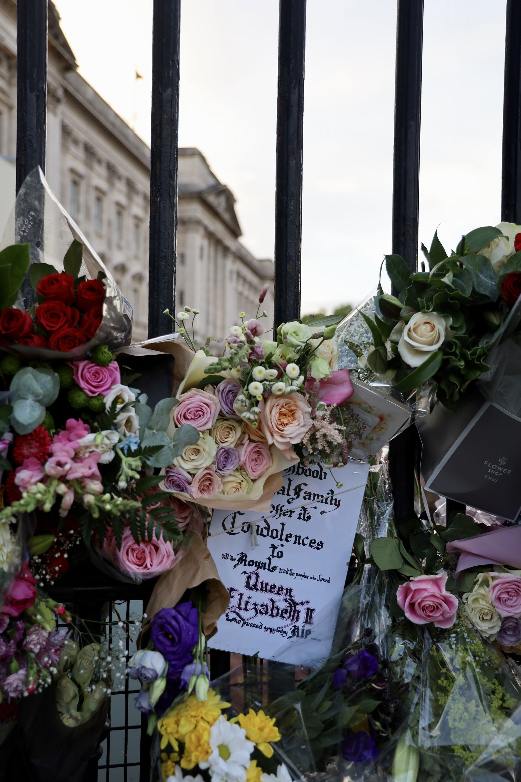 Los ramos de flores y los mensajes de pésame se amontonan también en parques como el Green Park londinense, cercano al palacio real, donde los ciudadanos han depositado ofrendas desde la muerte de la reina a los 96 años el pasado jueves.