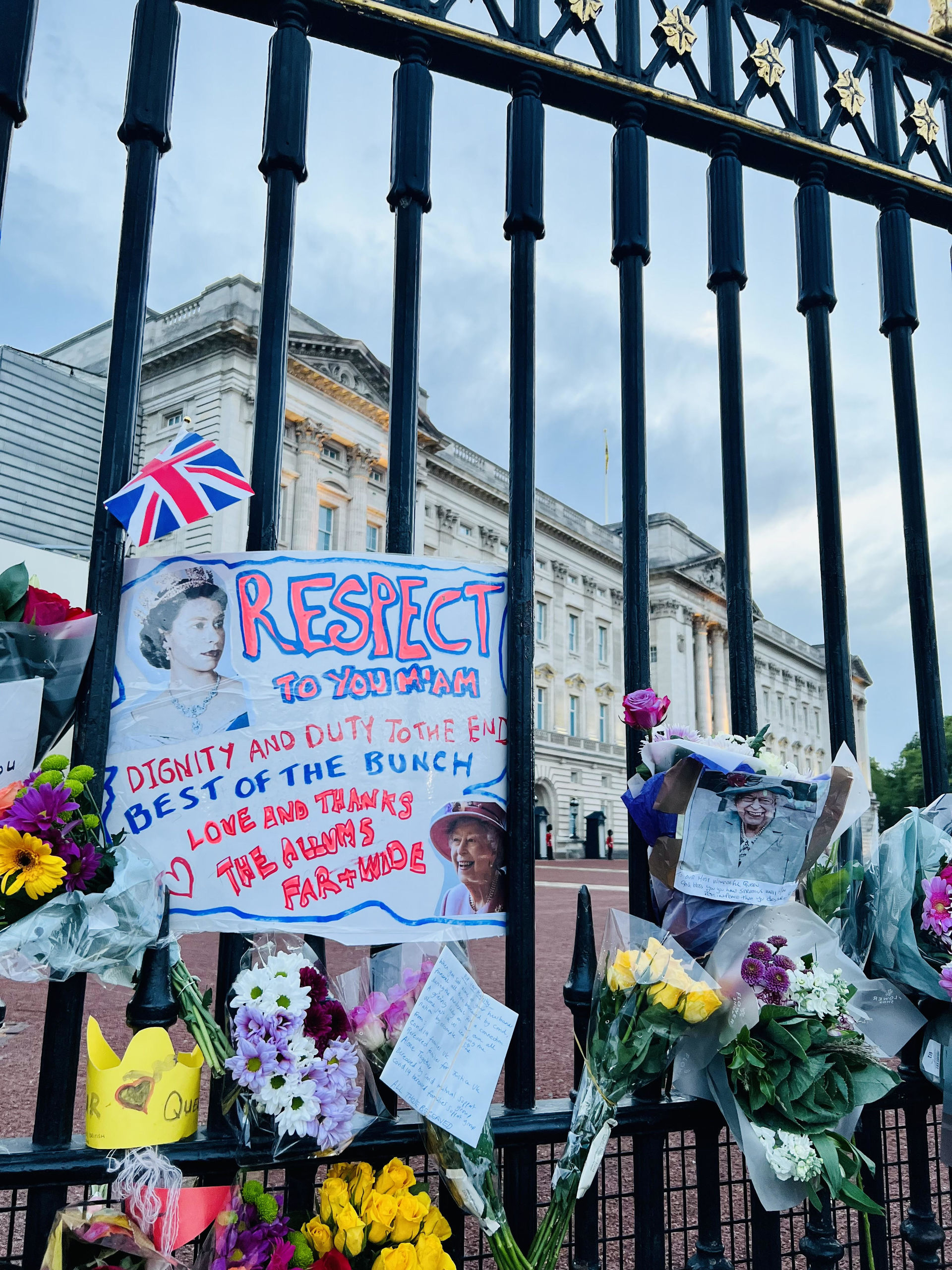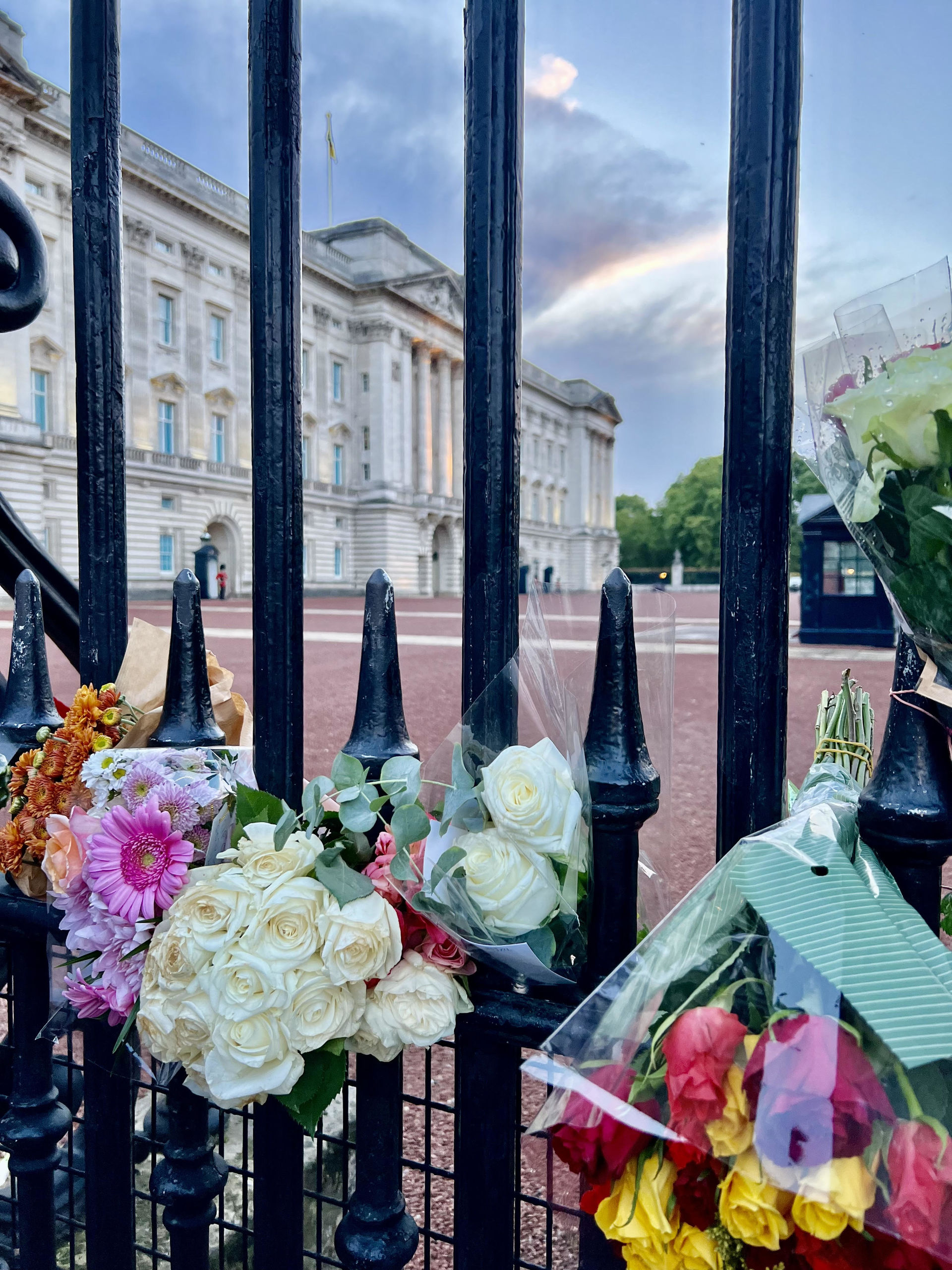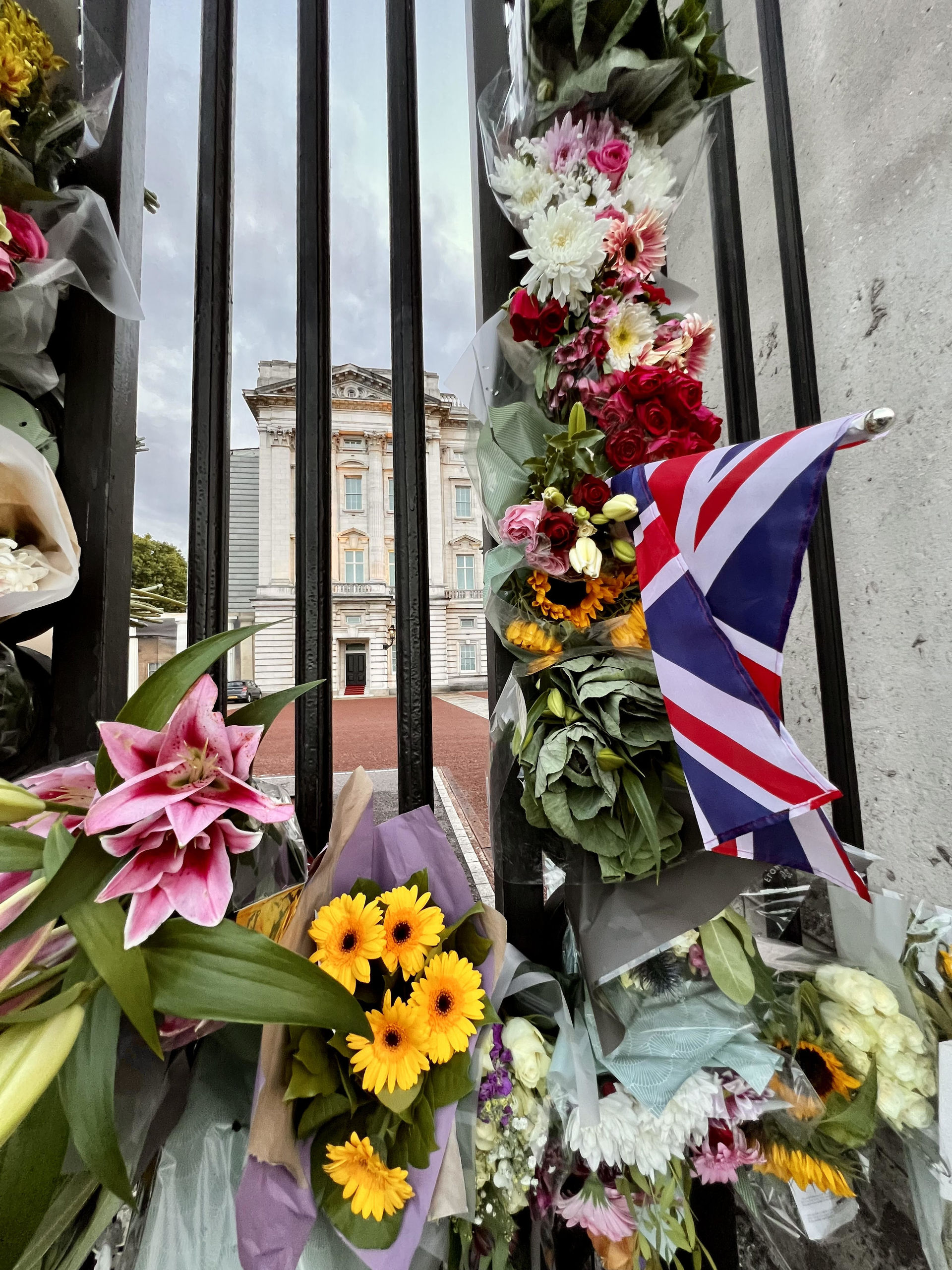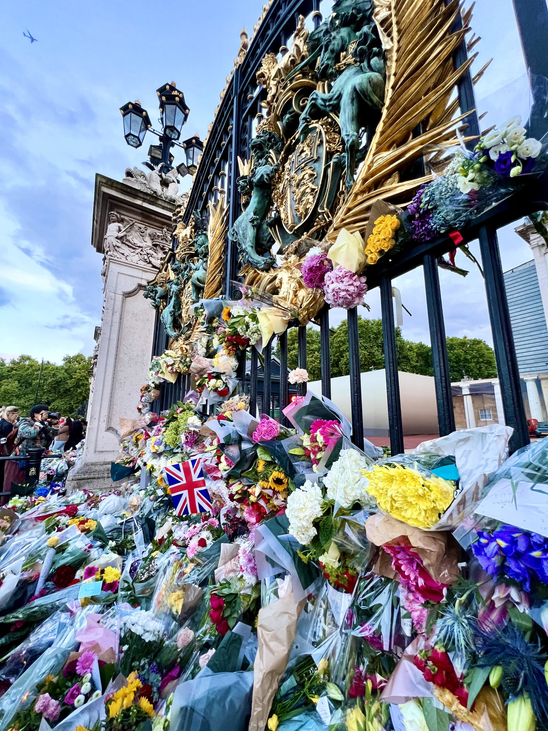 La verja del palacio real despertó ya impregnada de flores y mensajes de agradecimiento a Isabel II. Desde el anuncio de su fallecimiento, la ciudad entera se ha movilizado hacia el céntrico monumento para vivir una ocasión histórica y una despedida que se alargará durante varios días.