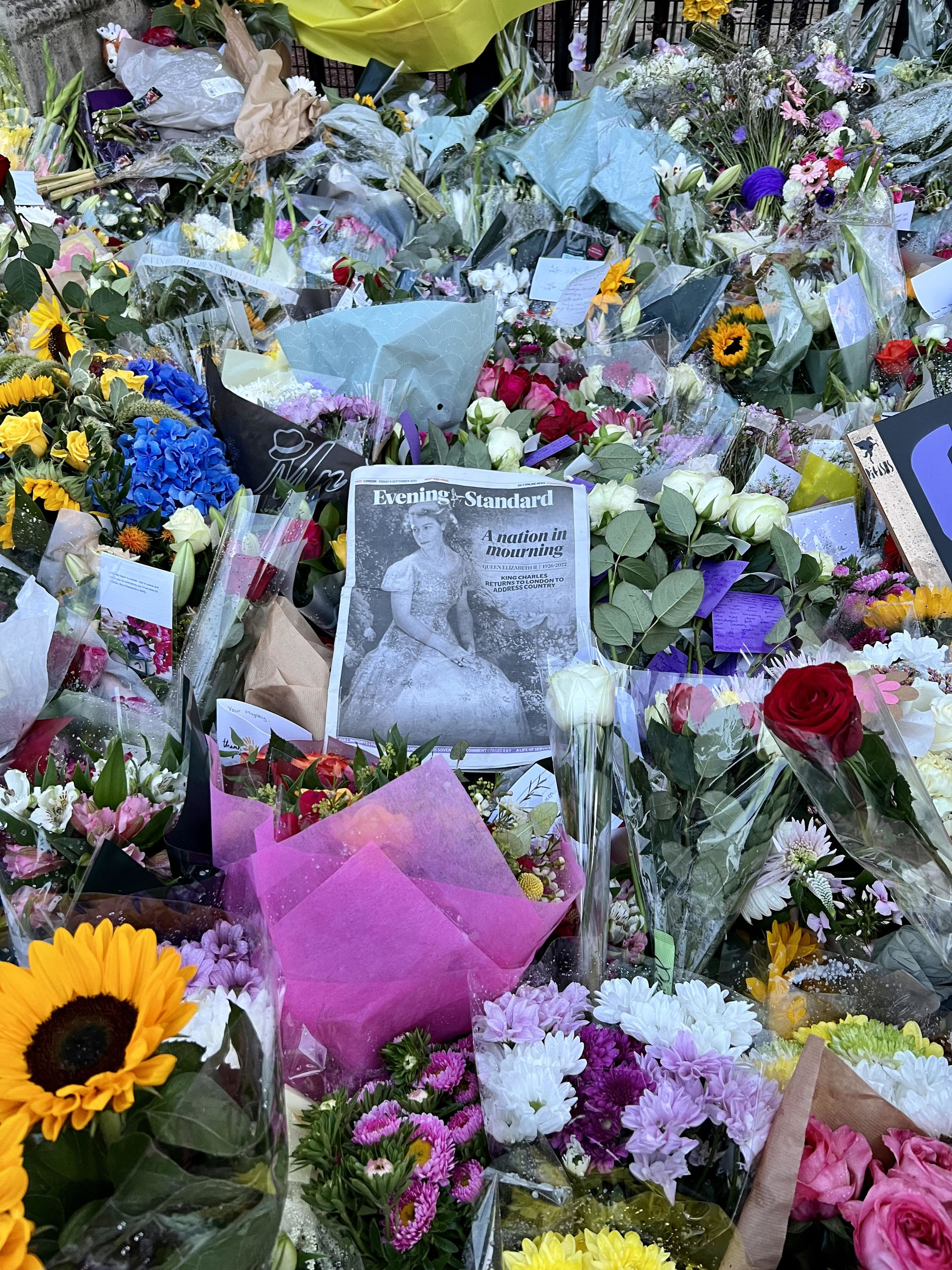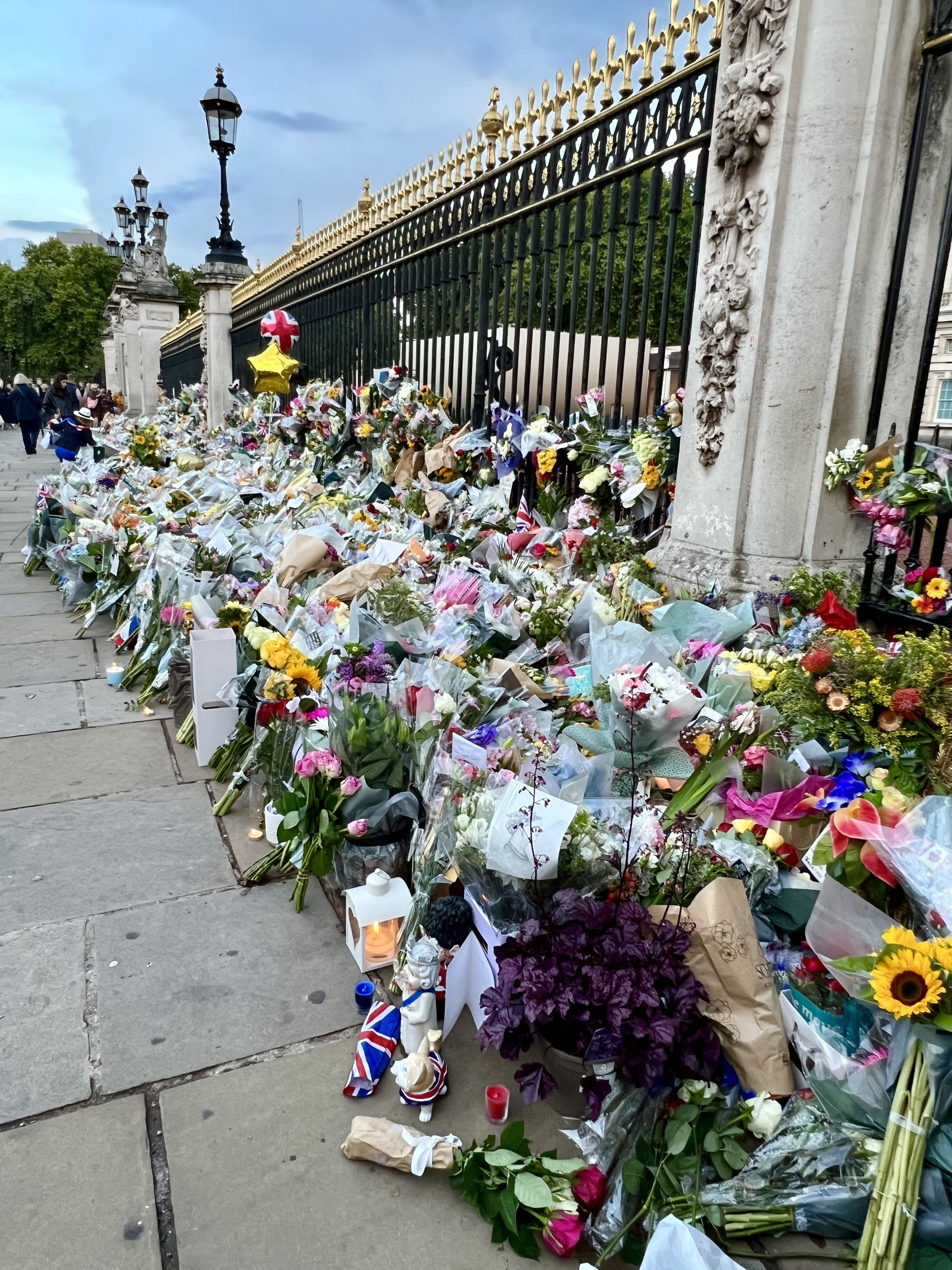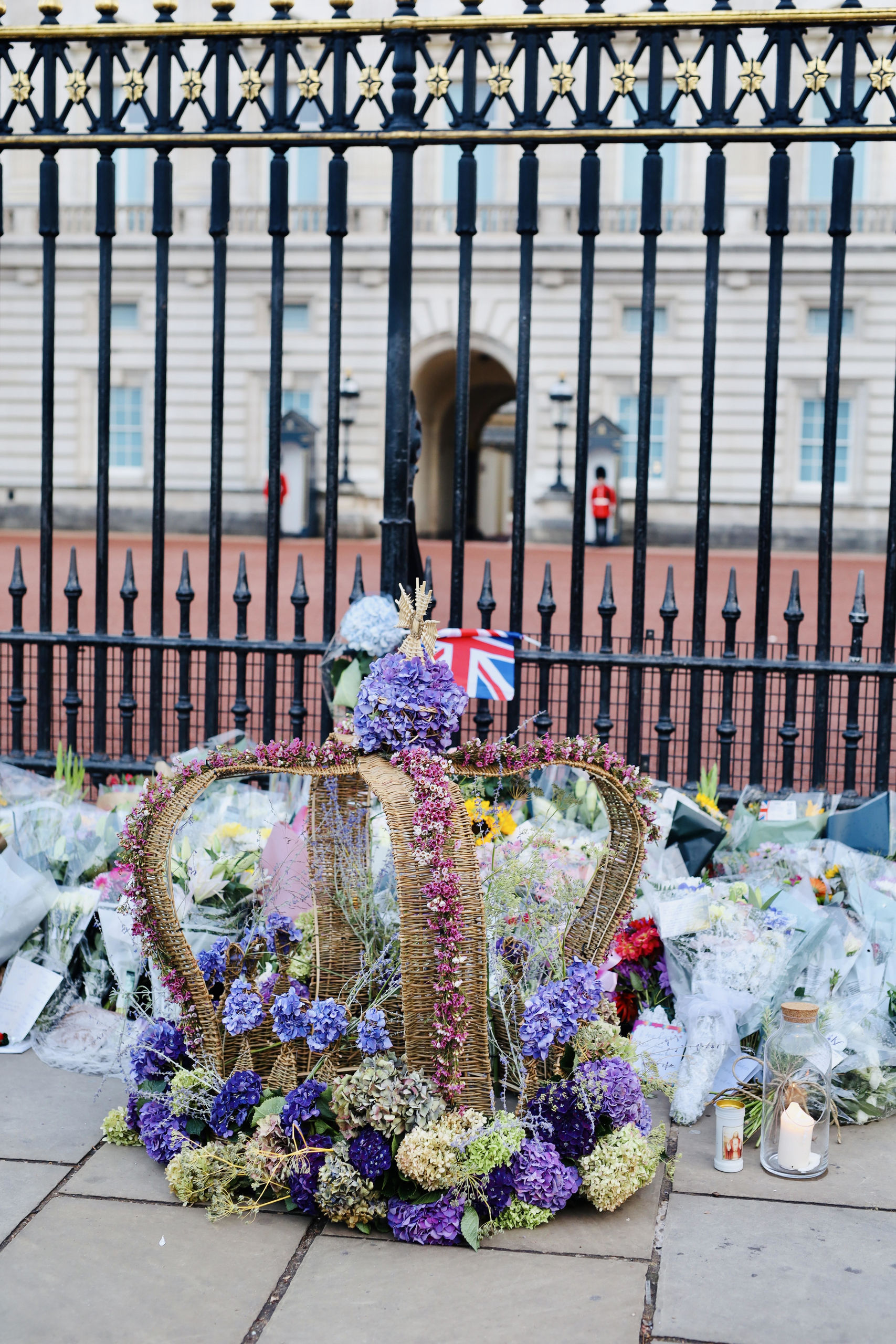 La verja del palacio real despertó ya impregnada de flores y mensajes de agradecimiento a Isabel II. Desde el anuncio de su fallecimiento, la ciudad entera se ha movilizado hacia el céntrico monumento para vivir una ocasión histórica y una despedida que se alargará durante varios días.