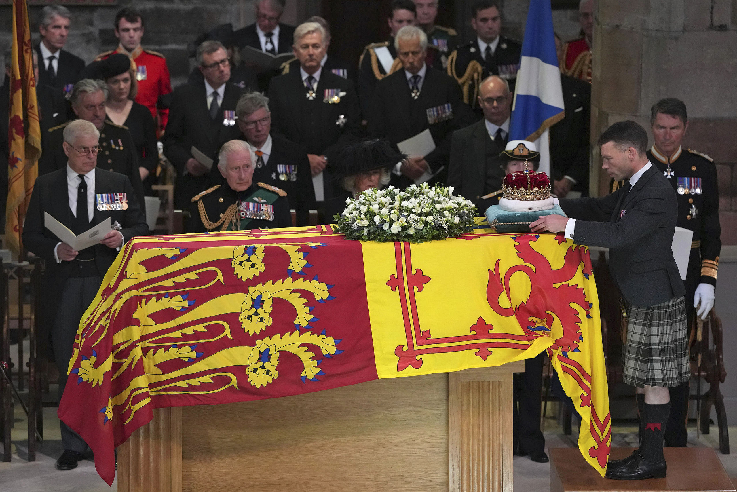 Por detrás del féretro, cubierto con el estandarte real de Escocia y una corona de flores, fueron a pie el rey Carlos III, la princesa Ana; el duque de York, Andrés, y el conde de Wessex, Eduardo, los cuatro hijos de Isabel II y el duque de Edimburgo, en un ambiente de respetuoso silencio de la gente congregada en el lugar.