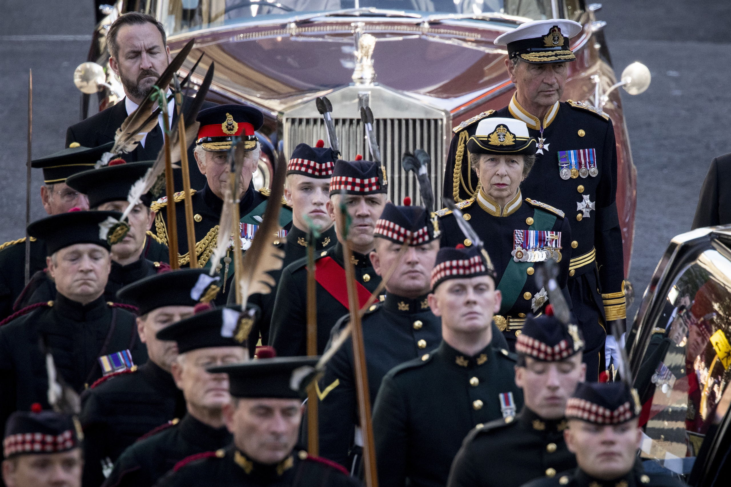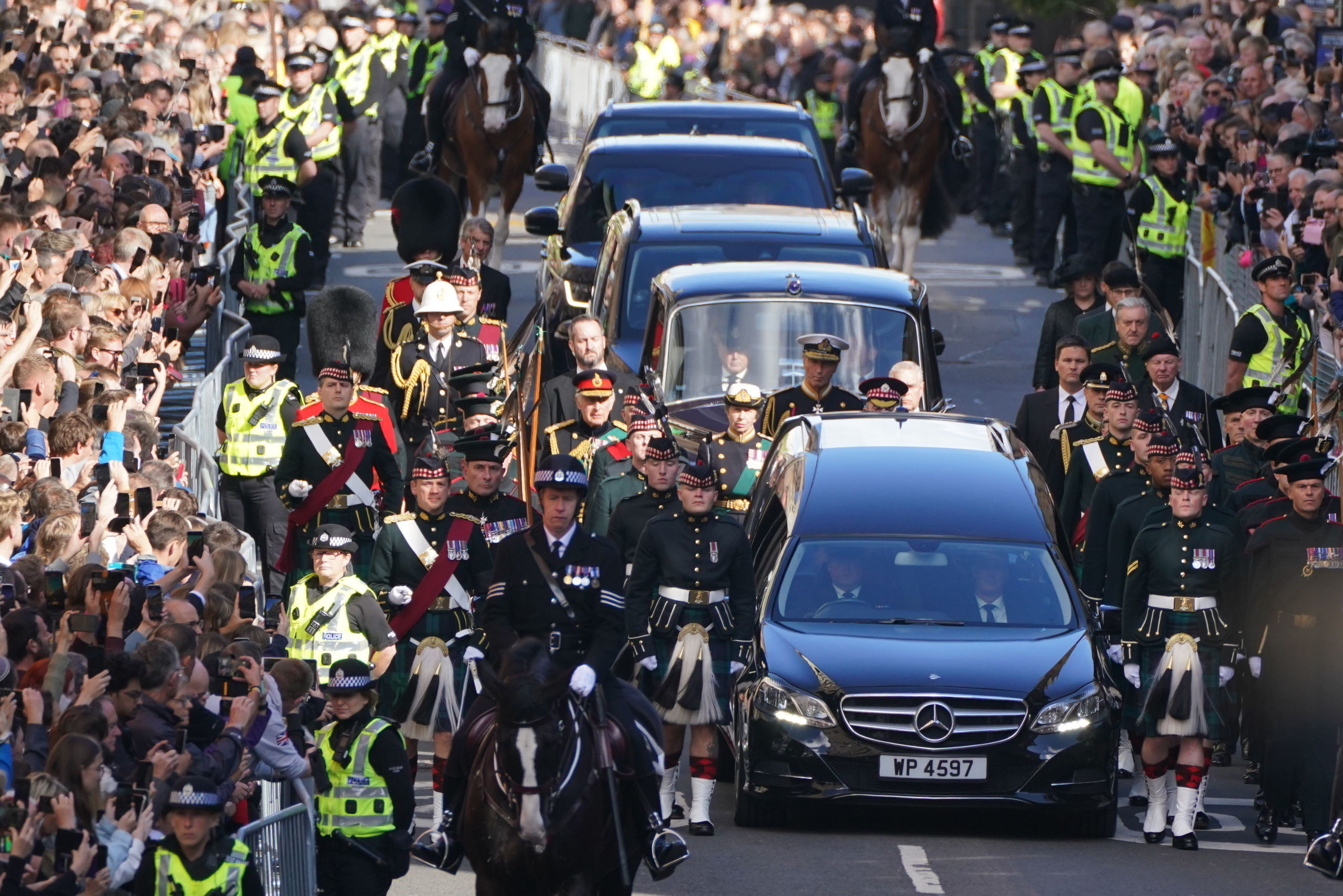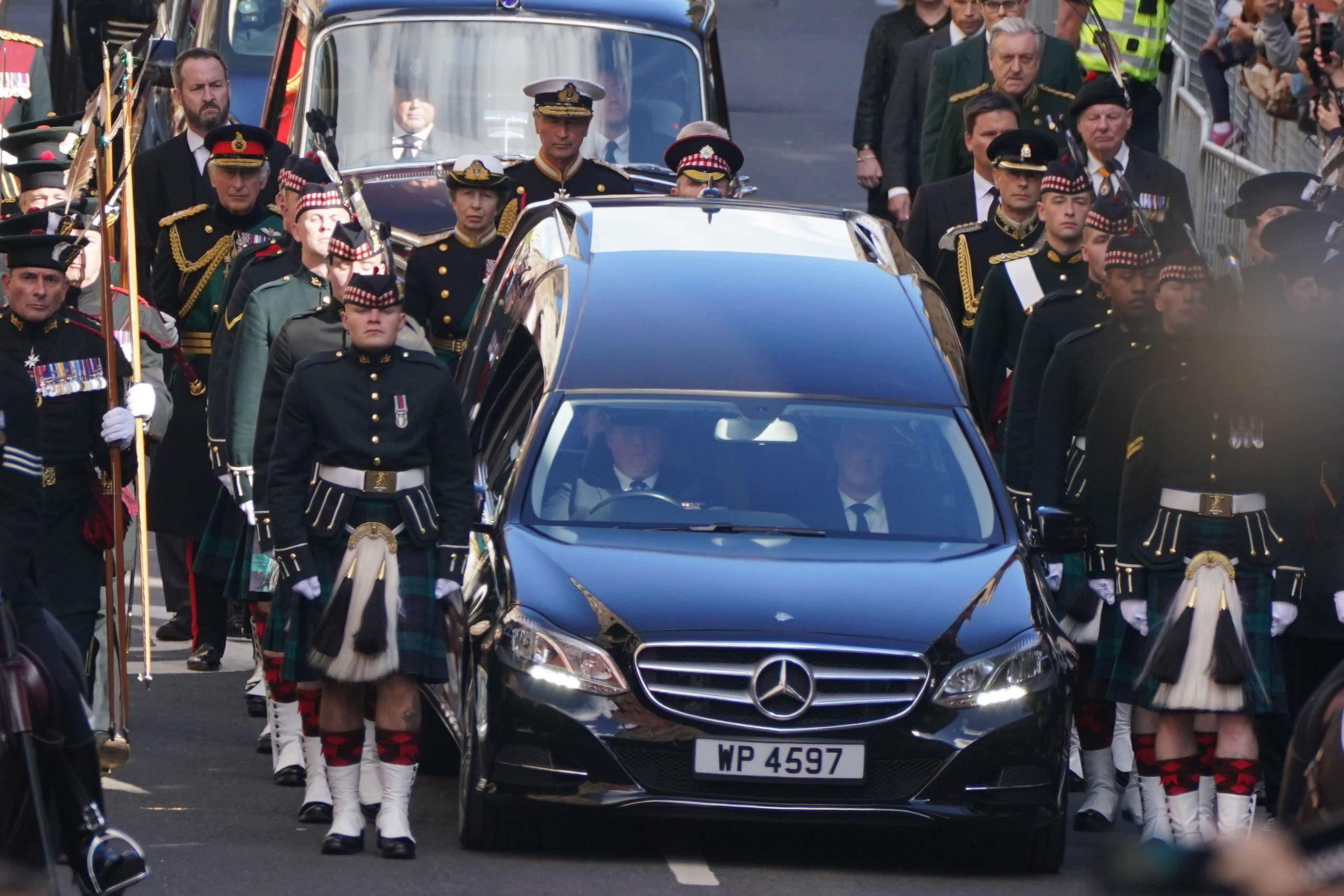 El coche fúnebre, que avanzaba detrás de dos policías montados a caballo, fue flanqueado por guardias del Regimiento de Escocia, con sus faldas tartán y sus boinas escocesas. Por detrás de los cuatro hijos de la reina, caminó el vicealmirante Tim Laurence, marido de la princesa Ana.