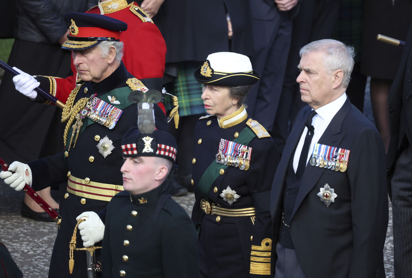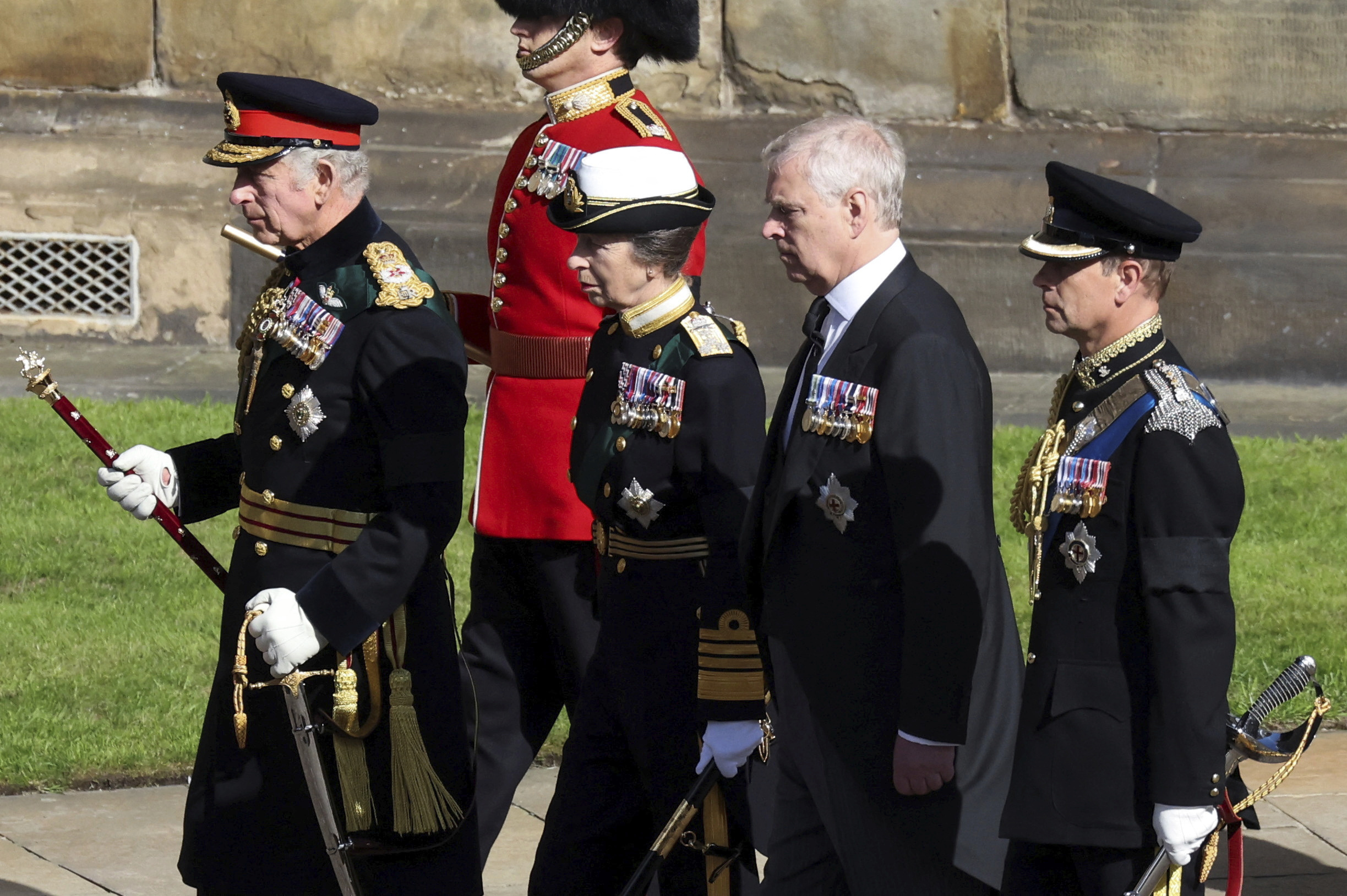 El príncipe Andrés fue retirado de la vida pública por el escándalo de abusos sexuales a menores envuelto en el caso del multimillonario Jeffrey Epstein. Durante el cortejo no se le permitió usar ropa militar, al contrario que sus hermanos Carlos, Ana y Eduardo, y en su lugar usó un traje negro.