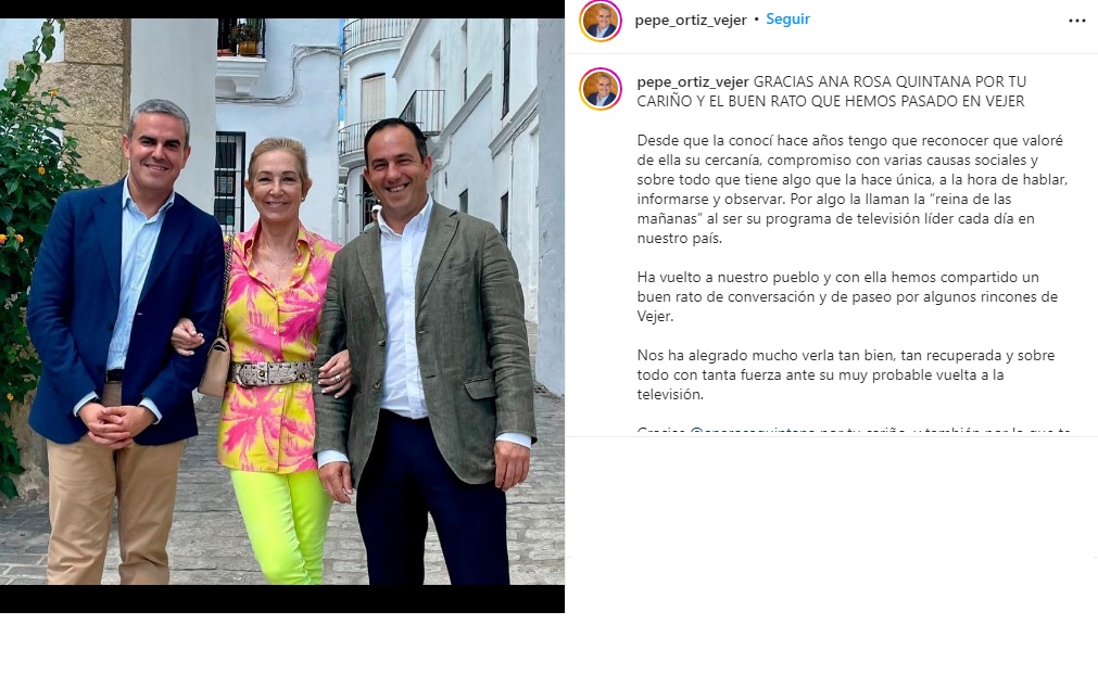 Ha sido José Ortiz Galván, alcalde de la localidad gaditana de Vejer de la Frontera, el que ha compartido una foto de la visita de Ana Rosa a su pueblo y le ha dedicado unas bonitas palabras. "Gracias por tu cariño, Ana Rosa, y el buen rato que hemos pasado en Vejer", comienza el texto. "Desde que la conocí hace años tengo que reconocer que valoré de ella su cercanía, compromiso con varias causas sociales y, sobre todo, que tiene algo que la hace única, a la hora de hablar, informarse y observar. Por algo la llaman la "reina de las mañanas" al ser su programa de televisión líder cada día en nuestro país".