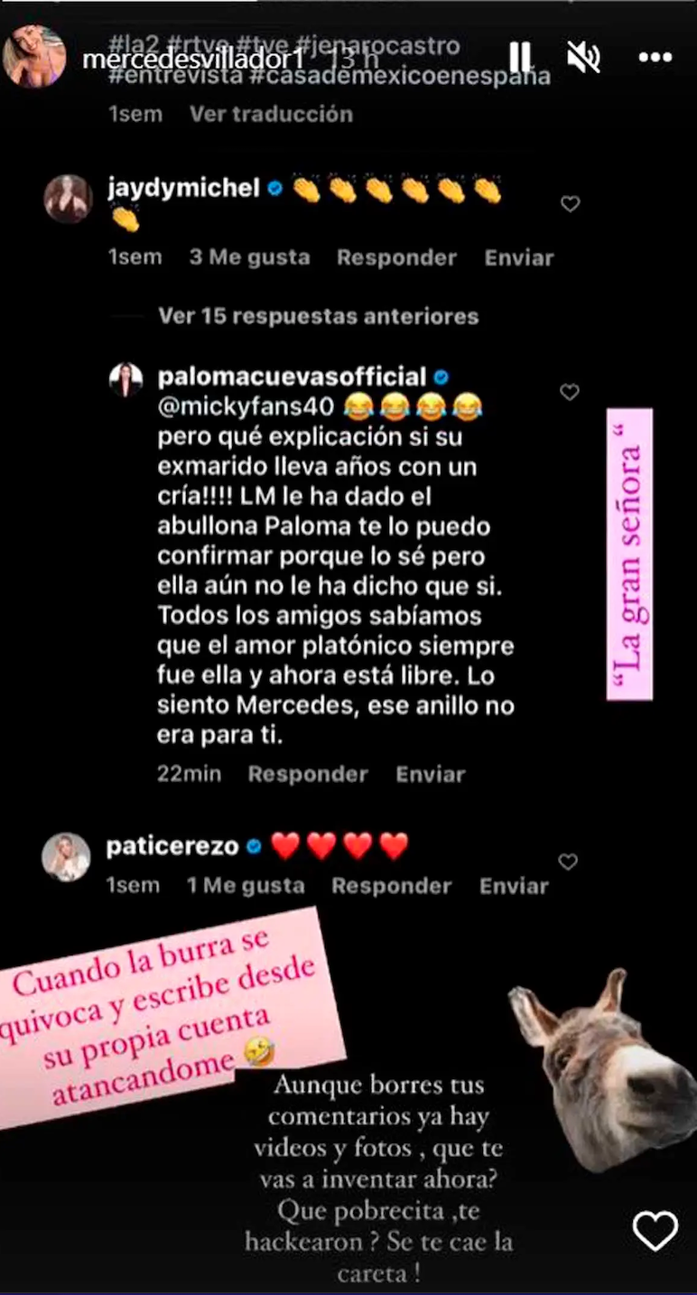 Mientras la información se difunde en distintos medios, sobre todo mexicanos, Mercedes Villador lo da por bueno y contesta con igual contundencia desde sus stories en redes. "Cuando la burra se equivoca y escribe desde su propia cuenta atacándome. La gran señora", escribe acompañando el comentario de una captura del comentario. Y añade: "Aunque borres tus comentarios ya hay videos y fotos…¿Qué te vas a inventar ahora? ¿Te hackearon? Se te cae la careta". La polémica está servida.