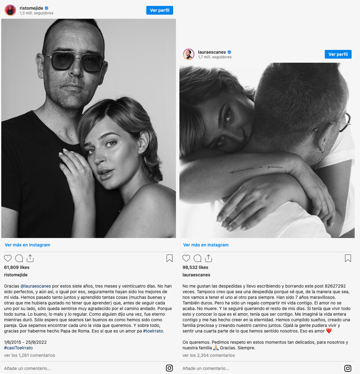 "No me gustan las despedidas y llevo escribiendo y borrando este post 82627292 veces. Tampoco creo que sea una despedida porque sé que, de la manera que sea, nos vamos a tener el uno al otro para siempre. Han sido 7 años maravillosos. También duros. Pero ha sido un regalo compartir mi vida contigo. El amor no se acaba. No muere. Y te seguiré queriendo el resto de mis días. Si tenía que vivir todo esto y conocer lo que es el amor, tenía que ser contigo", ha escrito la conocida influencer, ilustrando el texto con de una foto junto a ya su expareja Risto Mejide.