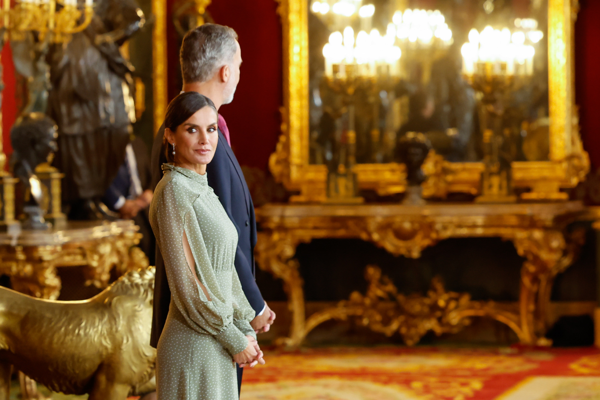 Para el desfile y la recepción de este año, la primera que transcurrió en total normalidad desde la crisis del coronavirus, la Reina vistió un vestido de Vogana. Un vestido en gasa de color verde con pequeños lunares blancos, escote cruzado y detalle de mangas abiertas.