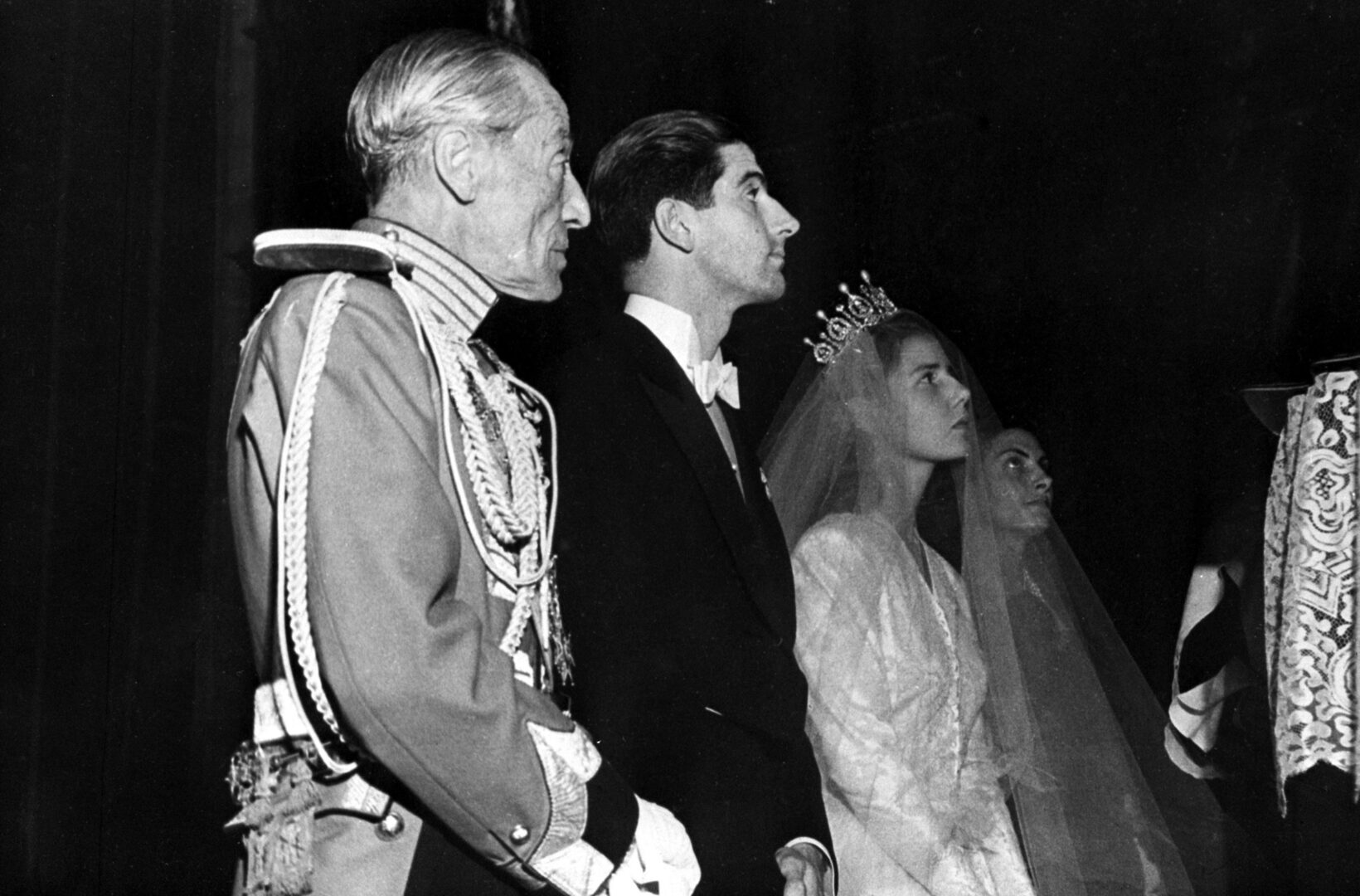 Aquel 12 de octubre de 1947, miles de curiosos se arremolinaron alrededor del templo, el majestuoso edificio de la Giralda, para contemplar la llegada de los novios. Ella luciendo un bellísimo vestido confeccionado en raso blanco con antiguos encajes, largo velo de tul sobre los hombros, tocada por una diadema de brillantes que había pertenecido a Eugenia de Montijo, emperatriz de Francia, pariente de los Alba. Daba el brazo a su padre y padrino, Jacobo Fitz-James, duque de Alba, representando a don Juan de Borbón, así como la madrina, la hermana del novio, duquesa de Almodóvar del Río, ejercía la misma representación de la reina Victoria Eugenia de Battenberg.