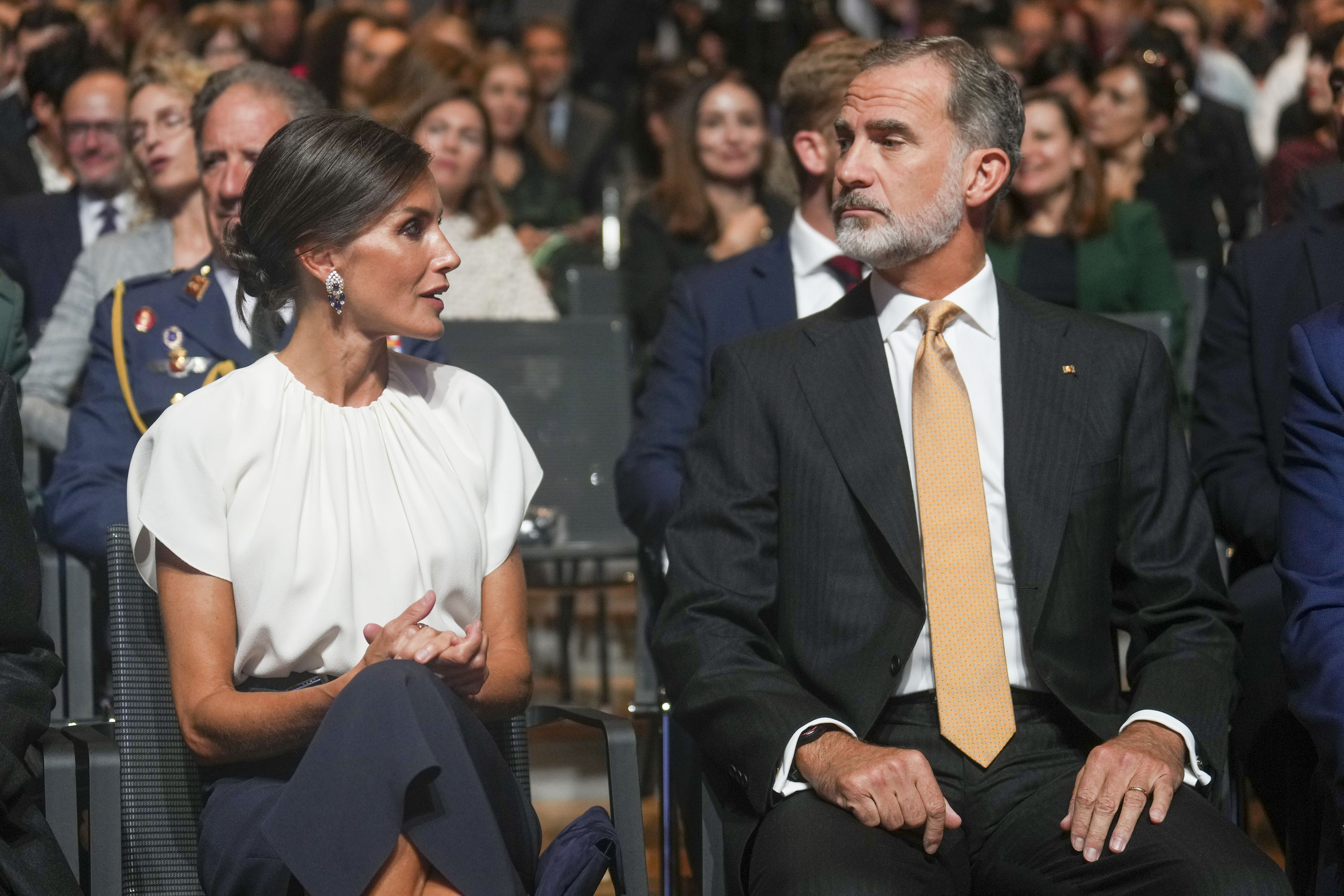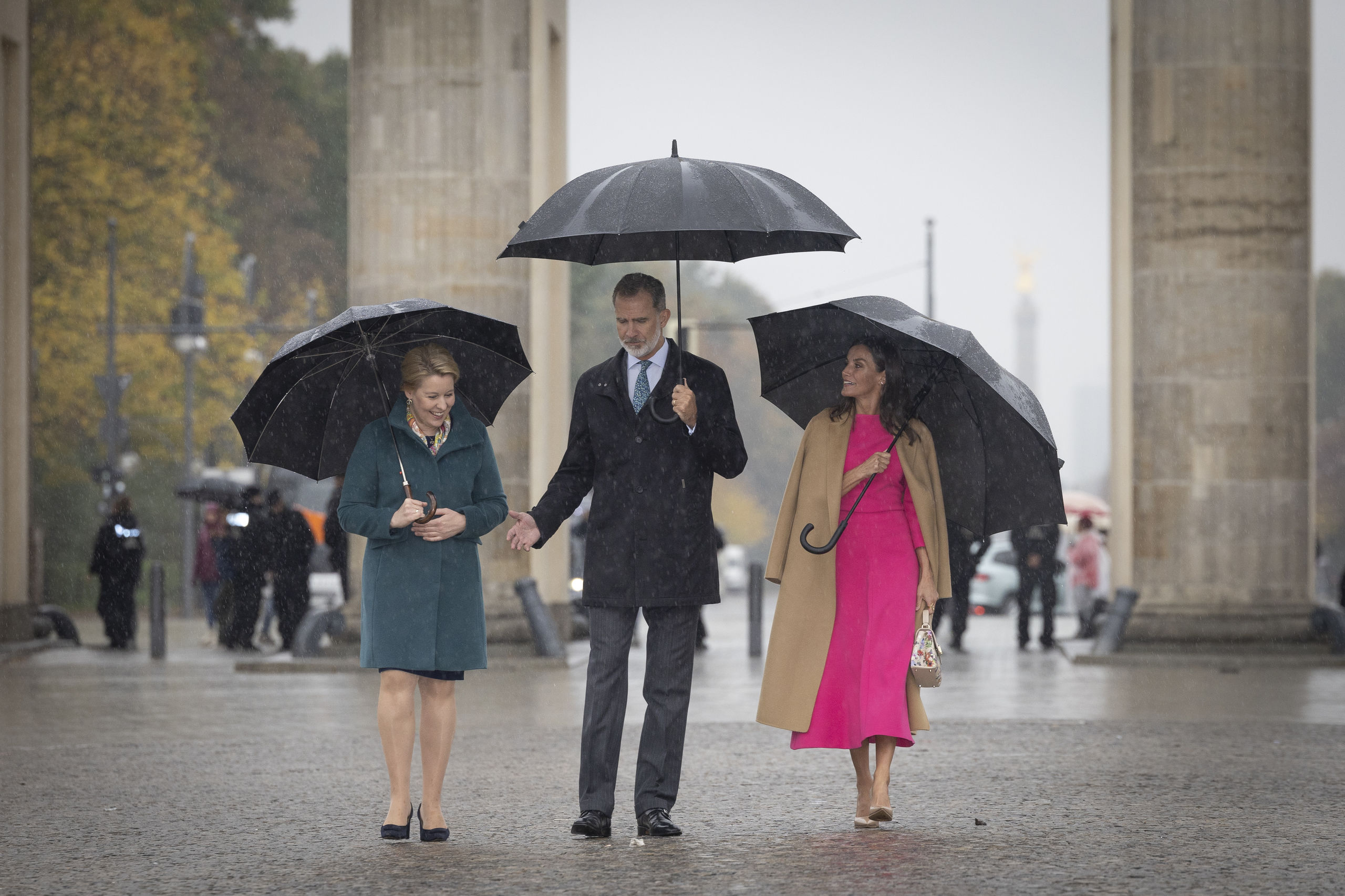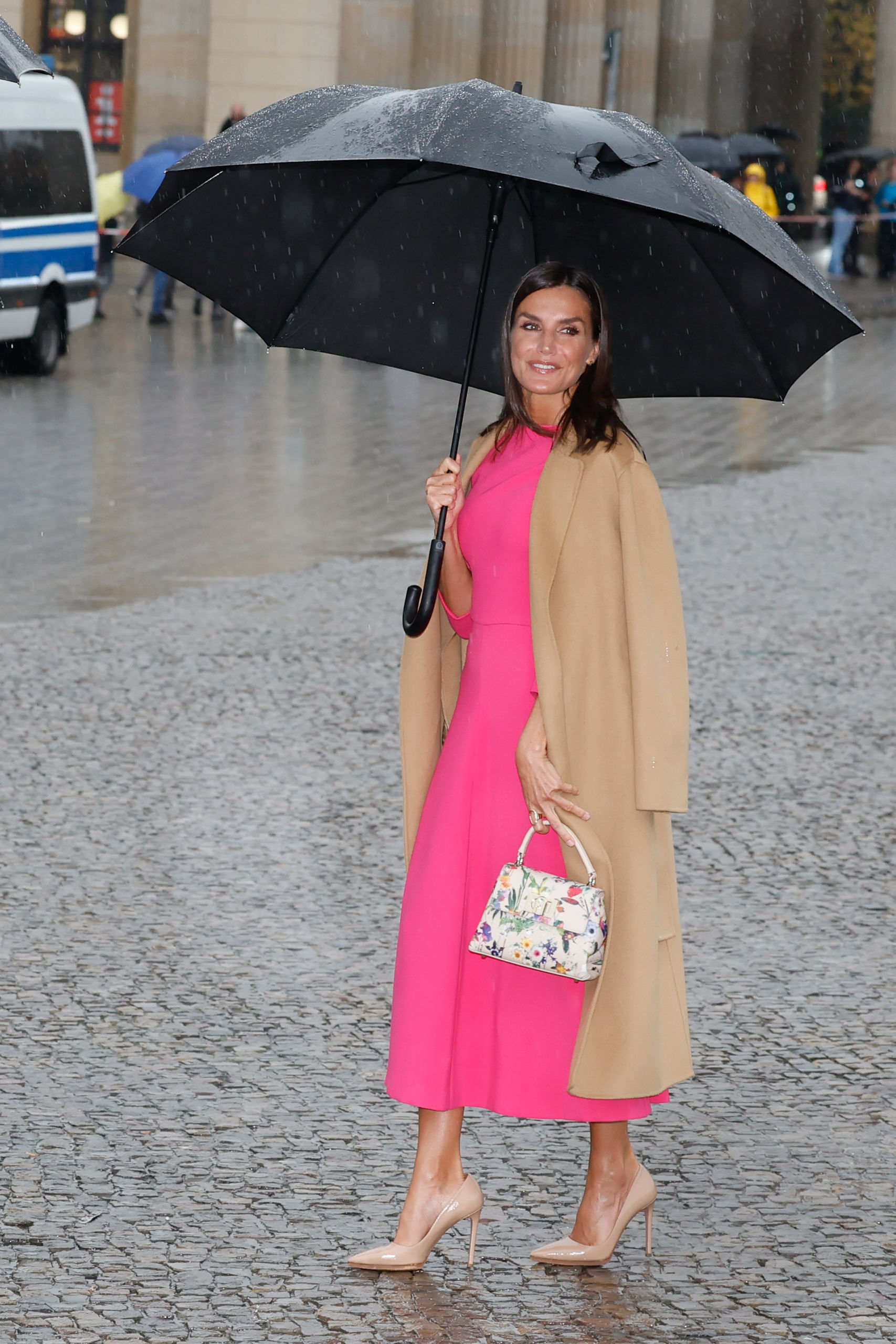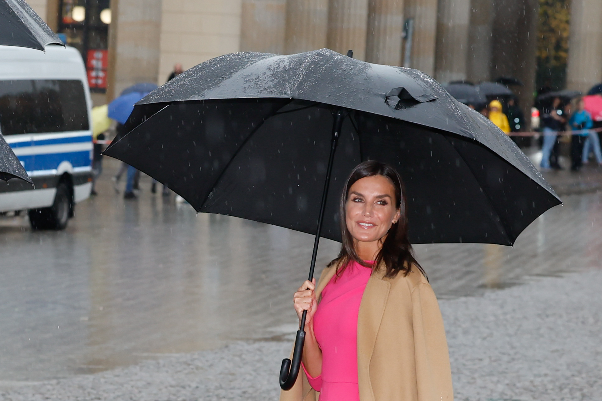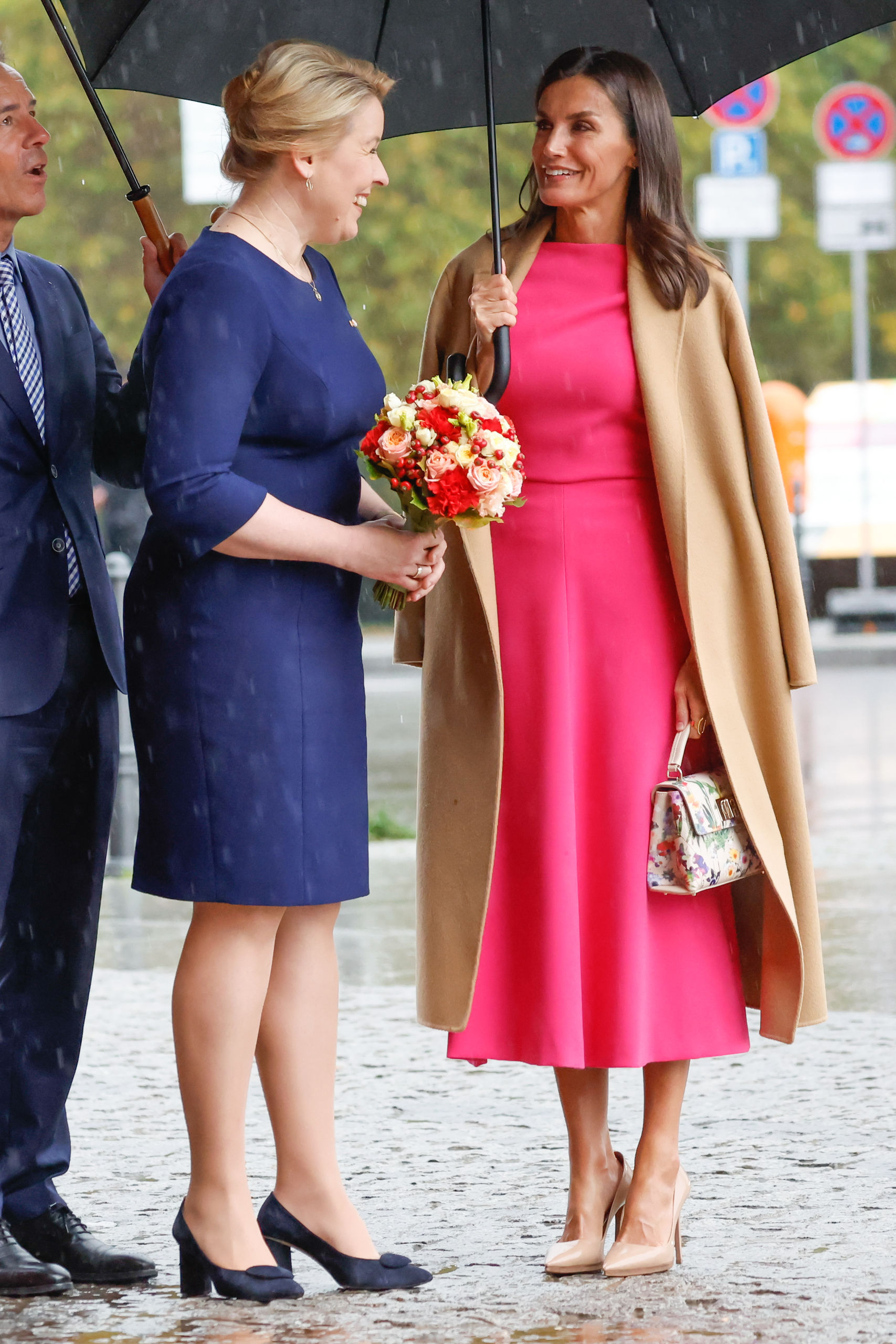 La lluvia acompañó la agenda de los monarcas durante todo el día, en contraste con el colorido estilismo que eligió doña Letizia para la jornada del martes.