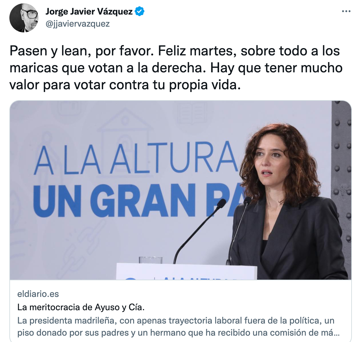 "Feliz martes, sobre todo a los maricas que votan a la derecha. Hay que tener mucho valor para votar en contra de tu propia vida", ha dicho Jorge Javier después de las palabras de Ayuso sobre la pérdida de la cultura del esfuerzo en los jóvenes españoles.
