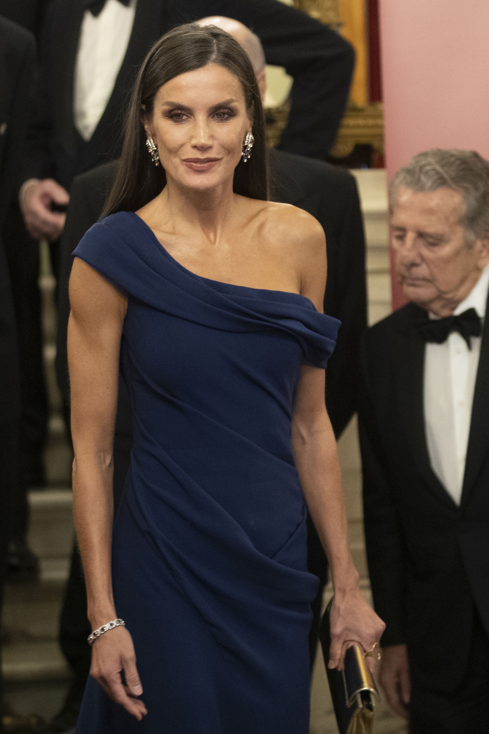 Letizia lo estrenó en 2017 durante el viaje oficial de los Reyes al Reino Unido. En la cena ofrecida por el alcalde de la City de Londres, la Reina lució este vestido azul largo con escote asimétrico muy sofisticado que entonces acompañó con la banda de Carlos III sujetado con el broche de flor de lis.