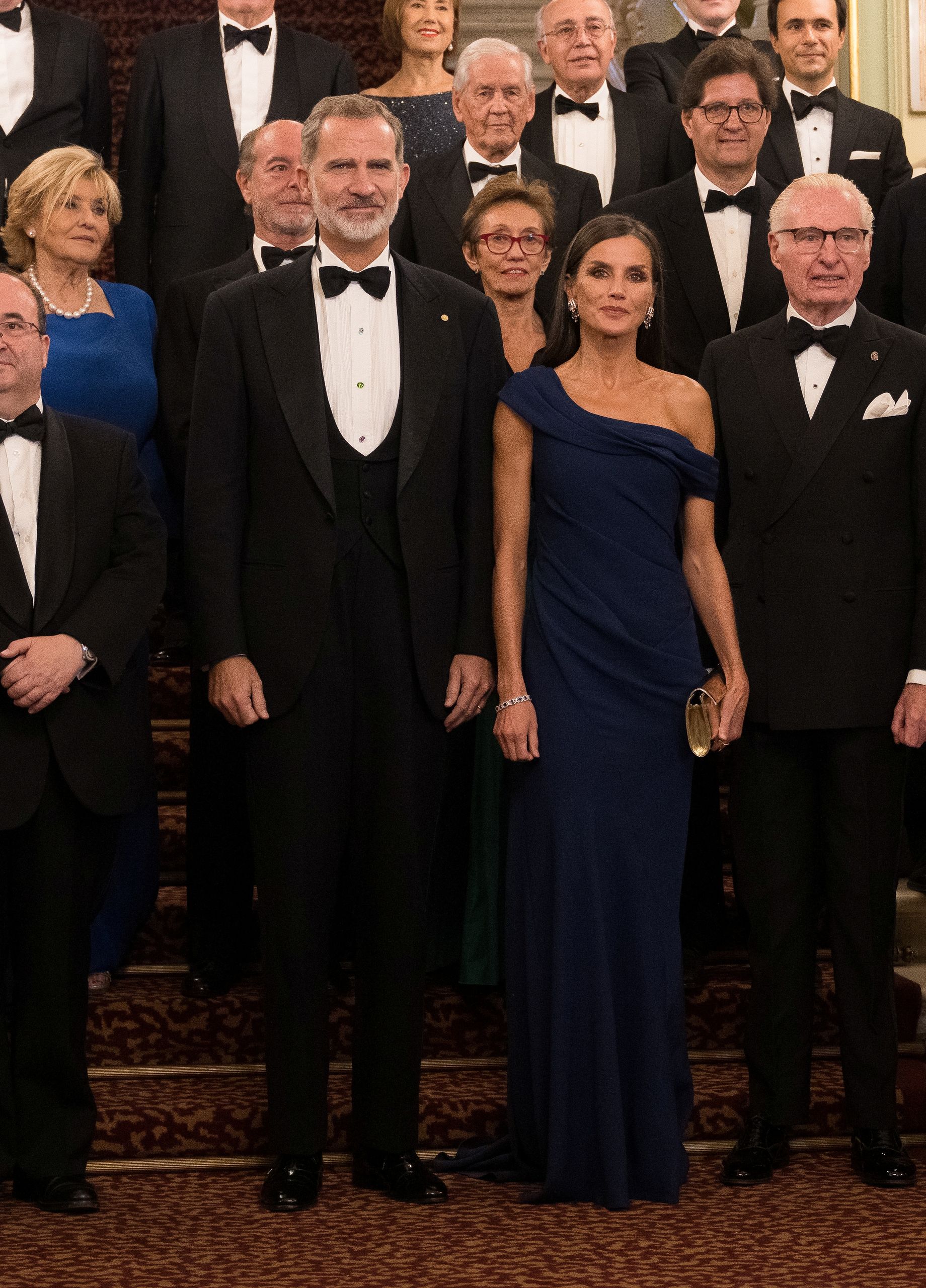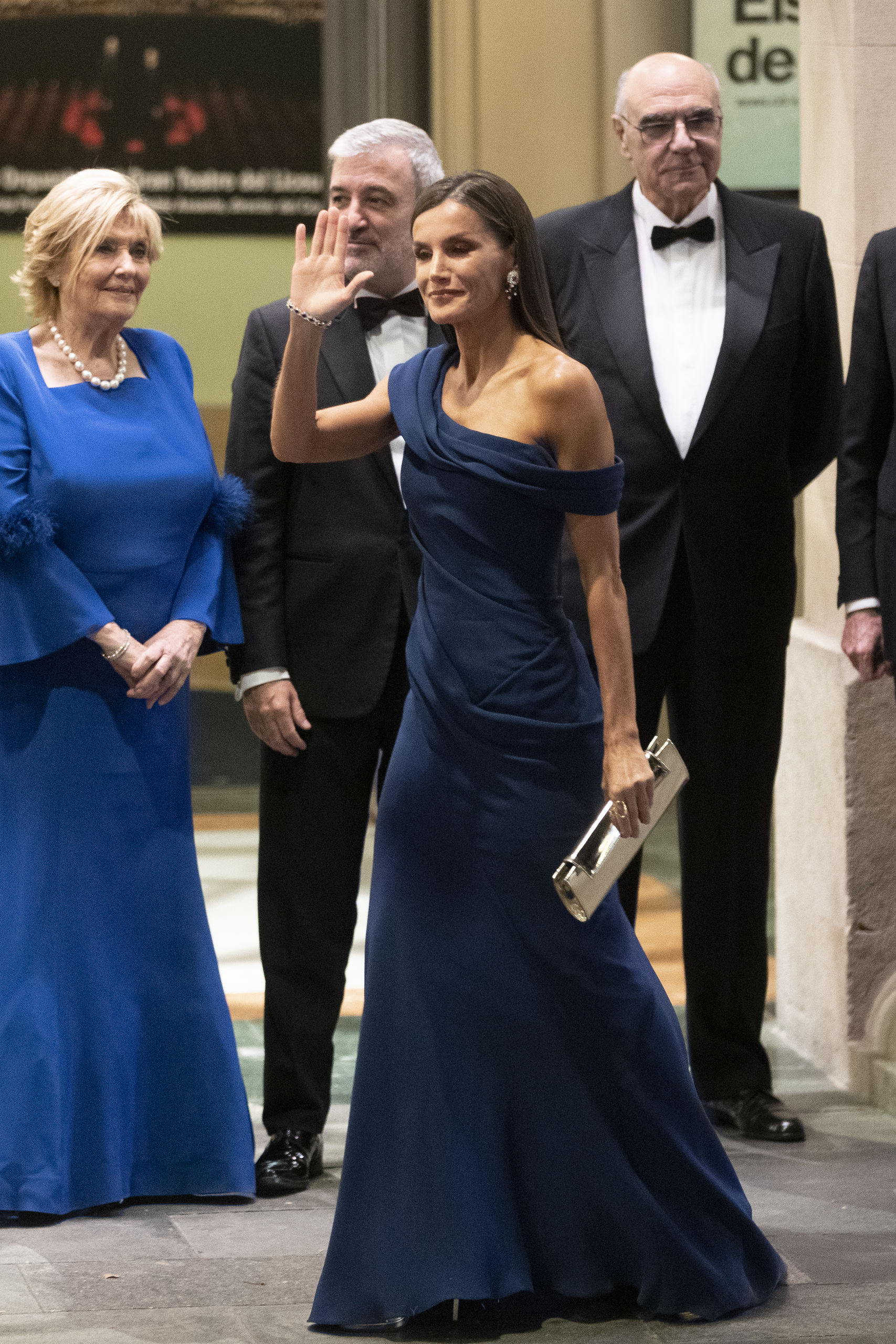 Para una ocasión tan especial y una gran noche de gala, la Reina escogió uno de sus colores más favorecedores: el azul marino. Algunos de los vestidos más impresionantes de doña Letizia son de este color y aunque no estrenó en Barcelona, rescató del armario este bonito diseño de Carolina Herrera.